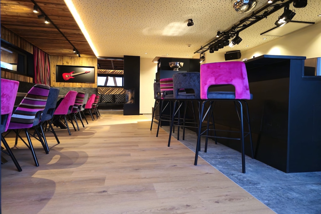 The central location of the kitchen invites you to cook and linger together. And after an eventful day in the mountains, you can relax in our padded lounge and end the evening in front of our large flat-screen TV. Experience the perfect mix of comfort and style - only in the group chalet. Special features such as an integrated cooling counter with beer tap (without beer) and a wine fridge are also available. Relaxation by the fireplace in front of one of two fireplaces, or pure relaxation in the private wellness area with your own outdoor whirlpool and sauna. Enjoy the fresh mountain air and the panoramic view from the large terrace balcony or spend sociable evenings on the rooftop terrace with barbecue area and a view over the entire valley.