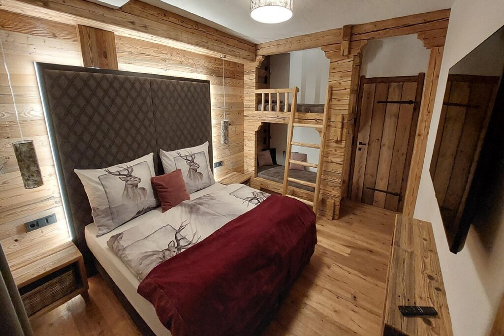 The chalet is rustic but modernly furnished, spread over 2 floors, and has a large living room with seating area, a modern fully equipped kitchen and dining table, 2 large bedrooms (both with 1 bunk bed each) and 2 bathrooms. The chalet also offers an outdoor terrace, a sauna (equipped with bathrobes, sauna towels and sauna oils), a laundry room with washing machine and dryer, an outdoor hot tub, 2 parking spaces in the carport with electric charging station, sun loungers, a grill and a table tennis table.