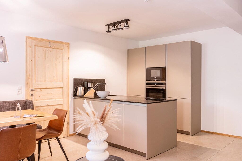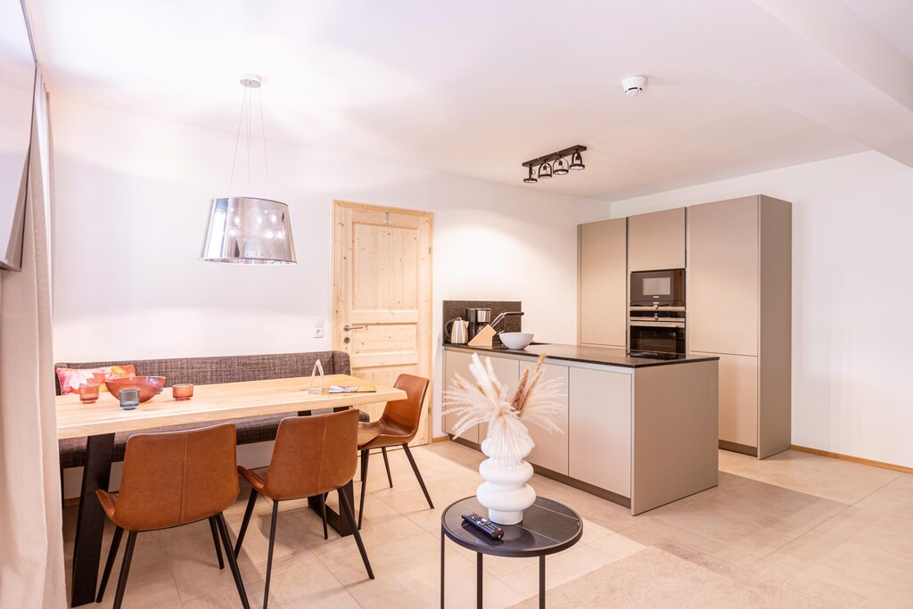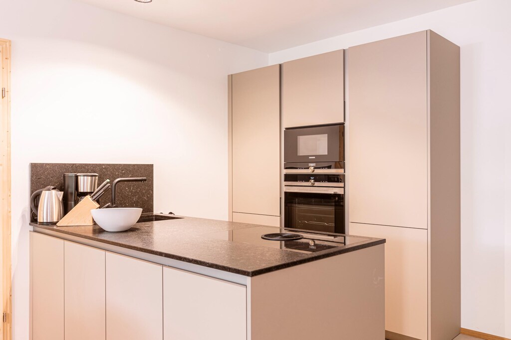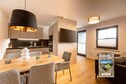 The open plan living and dining area is thoughtfully designed for relaxation and socializing. Unwind in the cosy seating area while enjoying your favorite shows on the flat-screen TV. Depending on the apartment's location, you can step out onto either the balcony or terrace to take in the surrounding views. The stylish kitchenette is fully equipped to meet all your culinary needs. It includes cutlery, cookware, a ceramic hob, oven, fridge with freezer compartment, and a dishwasher. Additional amenities such as a toaster, kettle, and coffee machine are also provided. A small starter set is available upon arrival, including a dishwasher tab, dishwashing liquid, sponge, garbage bags, cleaning, and tea towel. Stay connected with complimentary Wi-Fi throughout your stay.