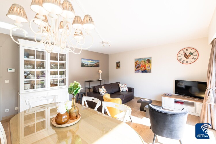 Welcome to your charming coastal retreat in De Haan! This sunny and stylish apartment offers everything you need for a relaxing getaway. With two spacious bedrooms, two modern bathrooms, and a cozy living space that includes a double sofa bed, it's the perfect setup for families or two couples traveling together. Step onto the fully south-facing terrace and soak in the serene views of the lush "La Potinière" park right across the street. The apartment is carpet-free, comfortably furnished, and located on the 2nd floor with elevator access.