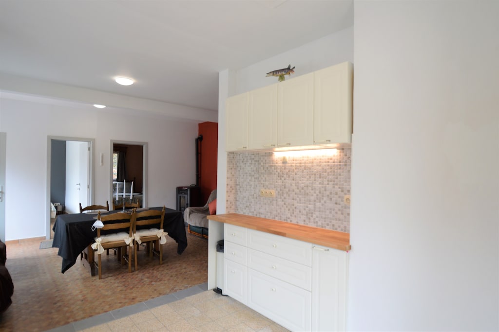 We hadden een betere accommodatie verwacht voor die hoge prijs. Vochtig koud huis, geen centrale verwarming, pellet kachel die veel lawaai maakt, verwarmen met de airco. Veel condens door de ramen met enkel glas. Allemaal oud meubilair (bed nog met spiraalbodem) zowel binnen als buiten. Zelfs geen schapje voorzien in de badkamer om het toiletgrief op te bergen. Wel een nieuwe praktische keuken. Beperkt huisgerei. Wel een zeer vriendelijke en behulpzame eigenaar! Prachtige locatie, Drukke steenweg
