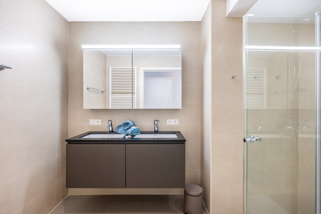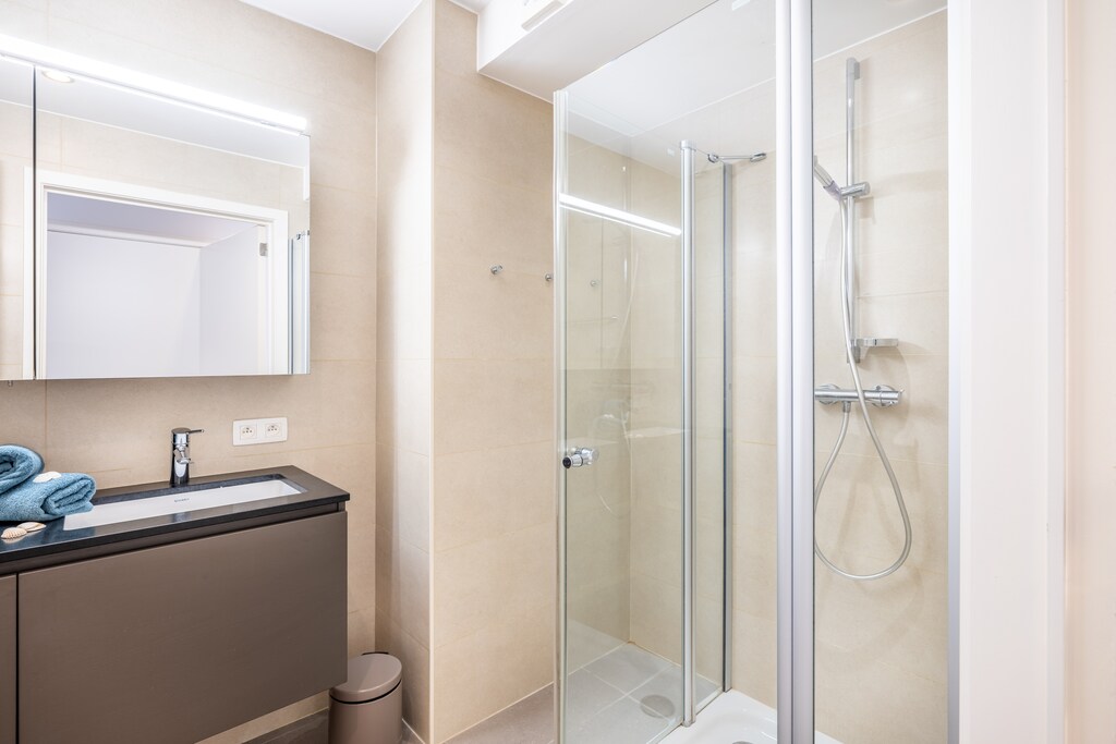 Very spacious living room with sea view, open equipped modern kitchen, 2 bathrooms (one with shower and one with bath), 2 toilets, spacious bedrooms, 2 with a double bed, one room with a single bed and one room with a bunk bed and a pull-out bed for one person. Balconies around the living room and kitchen.