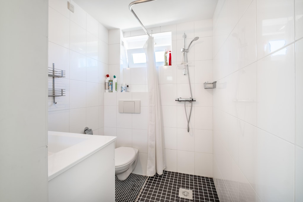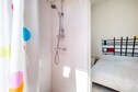 Through the room with the double bed you have access to the 2nd bathroom with bath, shower, sink and toilet