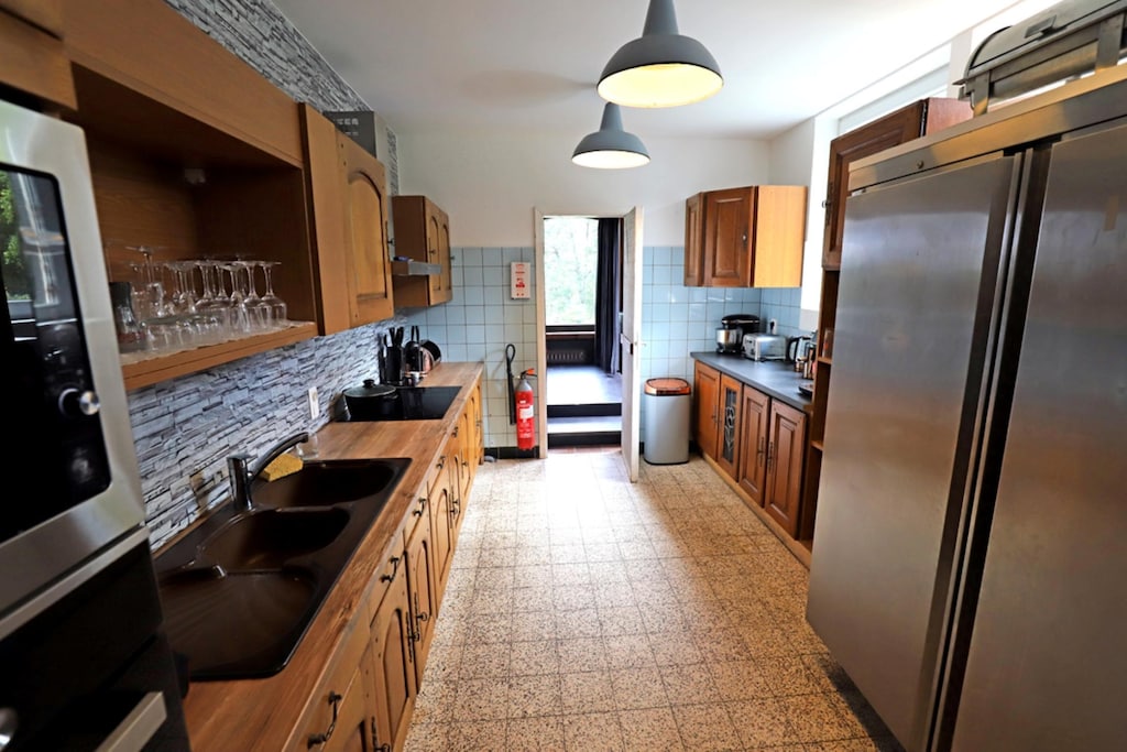 De beschrijving van het pand (en vooral van de ligging) doet geen recht aan de werkelijkheid. Dit voormalige hotel (inrichting en voorzieningen jaren ‘80, zonder hip te willen zijn) ligt op een kruispunt van drukke wegen, met als ‘bonus’ dat de eigenaren ook een verhuurbedrijf van auto’s en busjes hebben, waardoor de ruimte bij de entree volstaat met de handelswaar. ‘s-Ochtends komen de klanten… Achter het pand ligt een mooi gazon met een beek, daarachter een bos. De brug over de beek is echter zo verrot dat het gebruik verboden is. Het bos kun je dus alleen maar van afstand bekijken. Er is vanuit het pand verder geen verbinding met dit mooiere deel van de locatie. Het terras ligt aan de voorkant, aan de drukke weg en met uitzicht op de verhuurvloot. Binnen ligt een bonte verzameling oude spullen uitgestald. De keuken is acceptabel, maar om er te komen moet je een oud podium oversteken, voor mensen die slecht ter been zijn een flinke hindernis. De kamers en sanitair zijn heel erg oud, redelijk schoon, maar met vreselijke bedden. We hebben het hele pand gehuurd met 14 personen, maar kregen niet de beschikking over alle kamers. Eigenlijk zou dit pand niet via Belvilla aangeboden mogen worden, zeker niet met zo’n beschrijving.