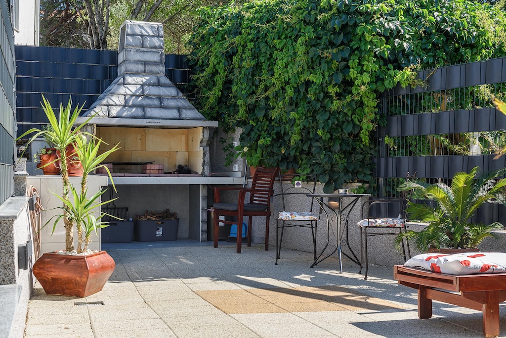 The apartment offers a spacious and welcoming layout, including a cozy living room with a flatscreen satellite TV, DVD player, and CD player. A fully equipped kitchen with modern appliances makes mealtime simple, while two comfortable bedrooms, one with a double bed and air conditioning, the other with twin beds, ensure restful nights. Guests can enjoy a private bubble bath, grill on the patio barbecue, and make use of a washing machine and private parking.