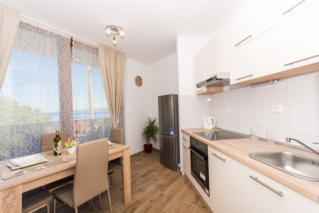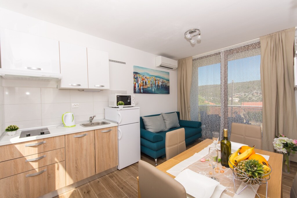 This lovely one bedroom apartment with furnished terrace and sea view is perfectly fit for up to four people. It features free WiFi, air conditioning and SAT LCD TV. The open space living room comes with sofa and sitting area, and it is combined with the equipped kitchen and dining table. The apartment has a private bathroom with shower and hair dryer.