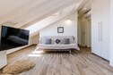 Apartment is located on two floors. First floor contains living room with sofa, bathroom, specious bedroom and kitchenette with dining area. In the attic you will find bedroom, bathroom, living room with two extendable couches as well as kitchen with dining area.