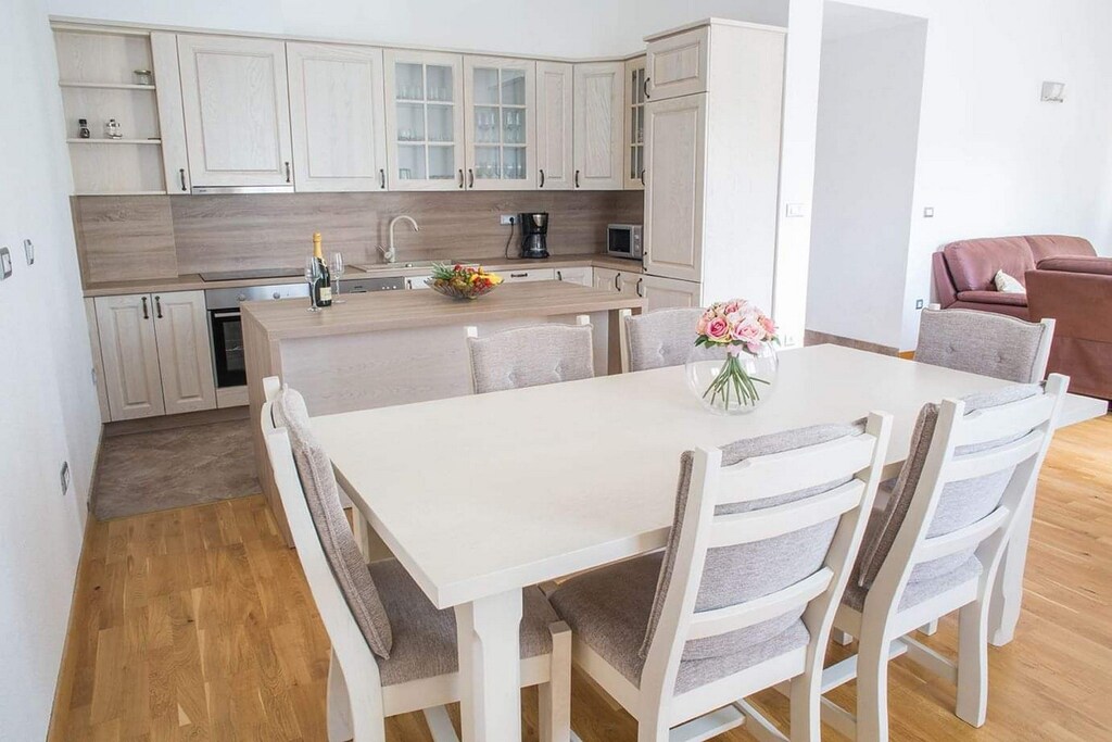 Spacious furnished sun terrace fitted with sunbeds and parasols, private outdoor seasonal swimming pool as well ass BBQ facilities and outdoor dining area are at you disposal, which makes this place ideal for a nice and relaxing family or friends vacation.