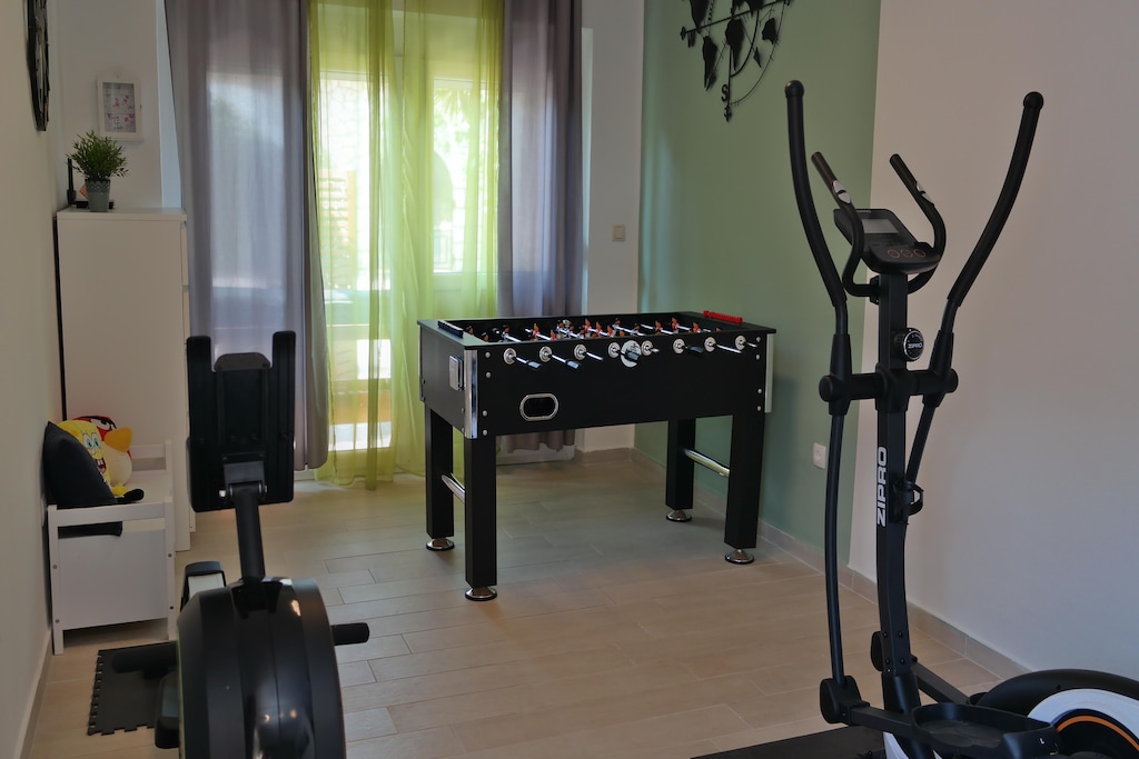Enjoy your time outdoors in the private fenced garden (300 m²), relax on the 25 m² balcony, or cool off in the private pool. A dedicated game room (25 m²) includes a PlayStation, table soccer, and a children’s corner, ideal for indoor fun.