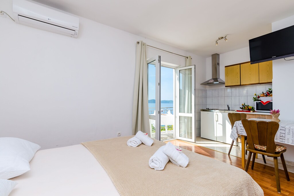 This comfort studio apartment features free WiFi, air conditioning and flat-screen TV, as well as kitchenette fitted with refrigerator, microwave, water kettle, coffee machine, toaster and dining area. Private bathroom comes with shower and hairdryer. It will also provide you with a lovely furnished balcony with sea view. Private parking is also provided, as well as a berth for boat. Baby cot and shared barbecue facilities will be at guests' disposal.