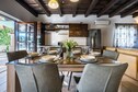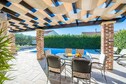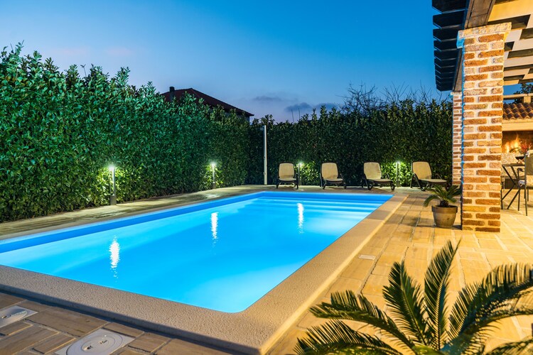Inside, the property features a spacious living and dining area with a flatscreen satellite TV and fireplace, a fully equipped open kitchen with modern appliances, and two cozy bedrooms with double beds. Guests can relax on the private roofed terrace, enjoy outdoor dining with the barbecue, or take a refreshing dip in the private swimming pool. Additional amenities include air conditioning, a washing machine, and a fenced illuminated garden for a comfortable stay.