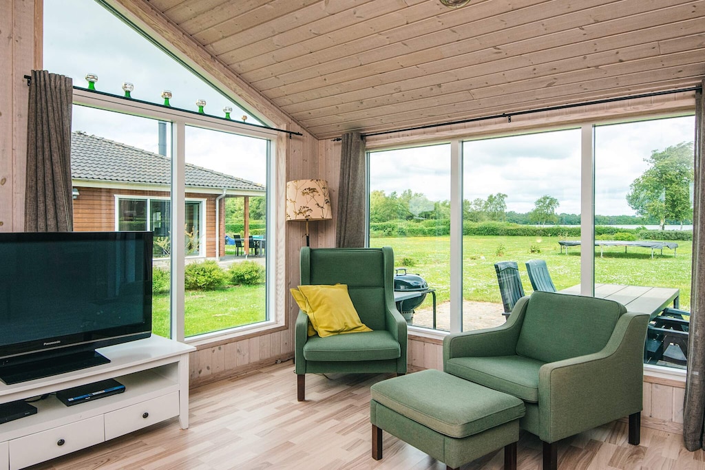 Child-friendly cottage with space for two families located in a family-friendly area and with an impressive panoramic view of Kvie Sø. The cottage is built with the best materials and with many good details. There are wooden floors in all rooms and the living room. The kitchen is open to the living room and dining room. The house is furnished in Scandinavian style. From the living room there is access to two terraces, where the sun and nature can be enjoyed in the garden furniture and via the entrance there is access to a terrace with morning sun. The house is practically furnished, so it is possible to divide the house in two. There is a large children's activity room here, where there is a television with DVD player and table football for the children's entertainment, while the parents have peace and quiet for conversation in the living room. Not rented to youth groups. Free access to water park and bowling.A refundable deposit might be charged closer to your check-in date. The security deposit ensures a smooth stay and covers any additional services or consumption charges.This deposit covers utilities consumed during your stay and any additional services that may be taken.The final amount will be adjusted based on actual meter readings, actual usage of extra services, and any remaining balance will be refunded within 21 days after checkout.This deposit simply acts as a prepayment for charges that you would anyways pay for, ensuring a seamless stay and check-out experience.