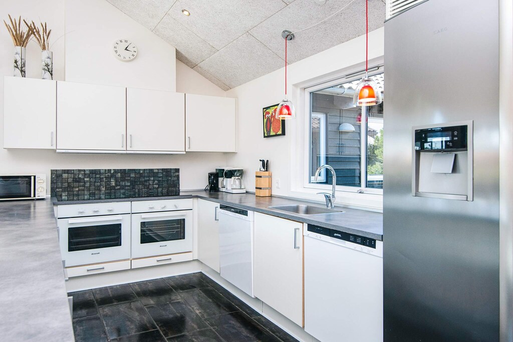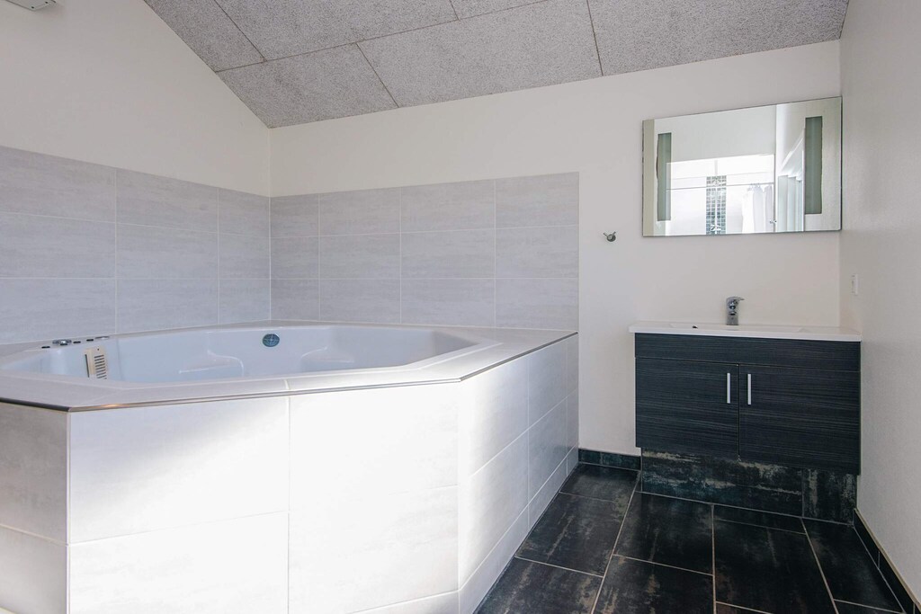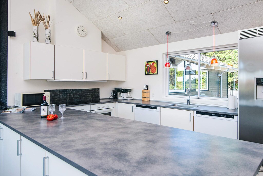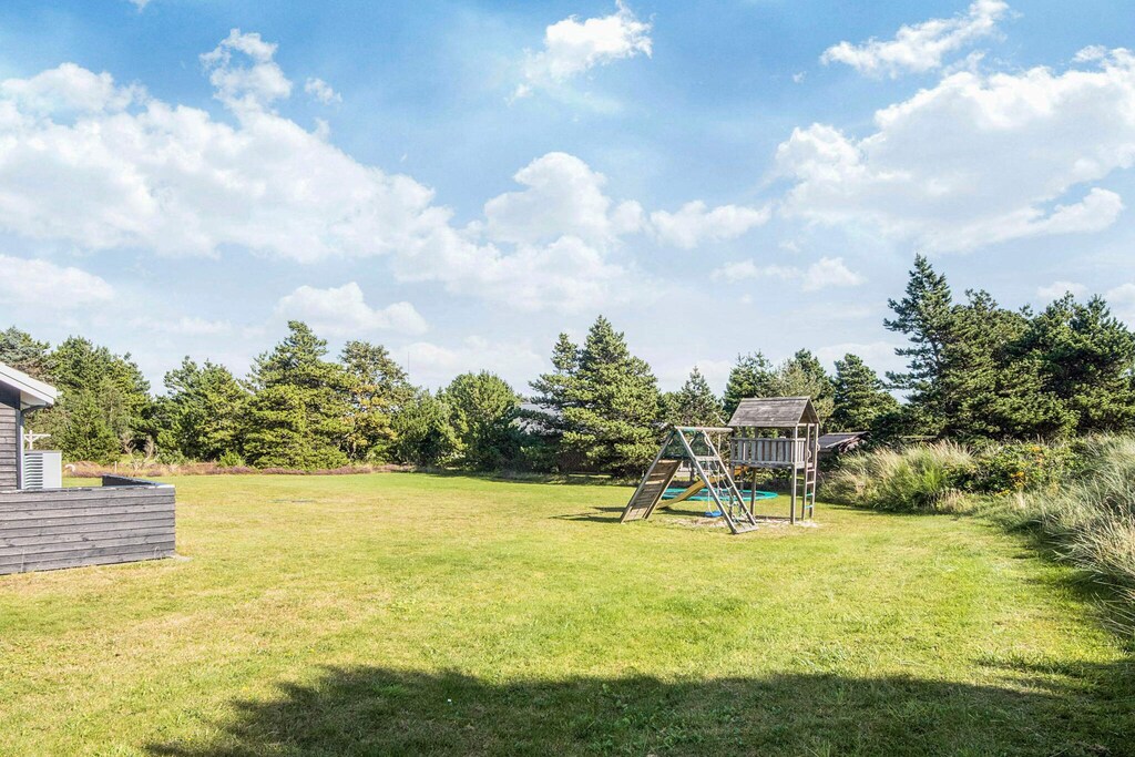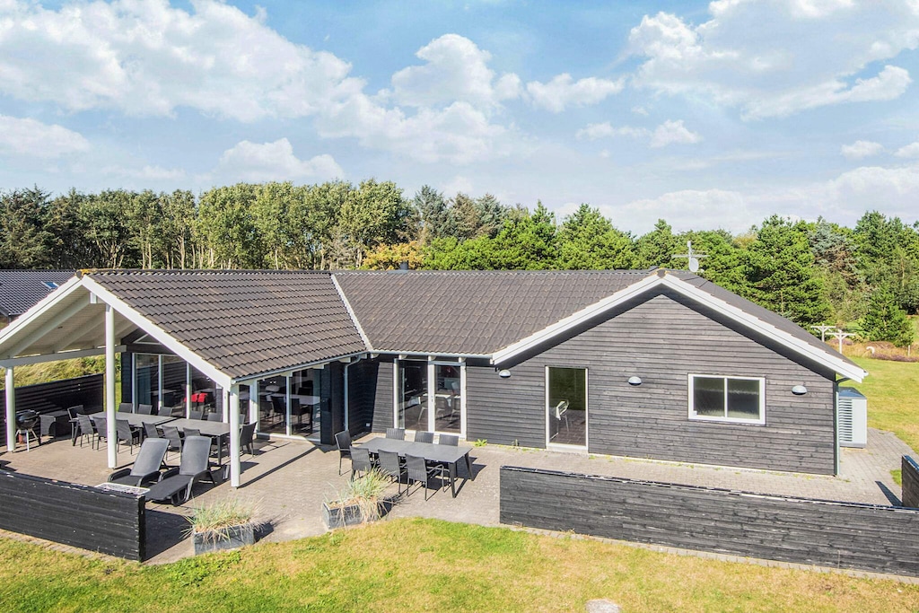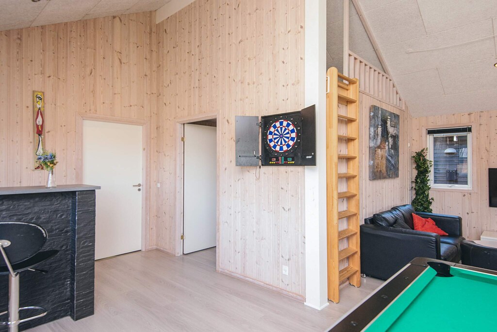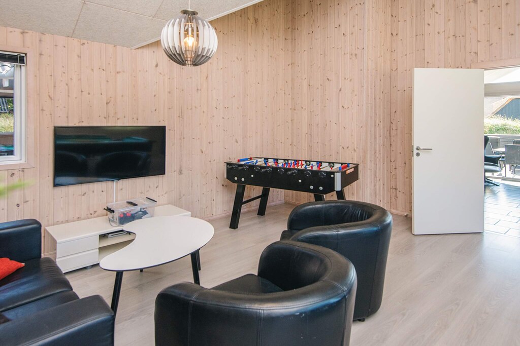 Well-structured activity house located on a sheltered natural plot with dunes in walking distance to the city life and the beautiful white sand beach that is the signature of Blåvand. The house suits both one or several families sharing with good space and facilities for 18 persons. The house has three bathrooms and seven bedrooms as well as a large mezzanine, all decorated in a good and modern style, and several rooms have TV, DVD player and activity game consoles for Nintendo Wii U and PlayStation3. There are TVs in the activity room, on the mezzanine as well as in the family-dining room. One of the bathrooms has a prefilled 6-8 people whirlpool and a spacious sauna. Both kids and grown-ups alike will enjoy the activity room that has e.g. table football, billiards and table tennis. There are several terraces surrounding the house where you can enjoy nature in the garden furniture. Surrounding the house are several tile terraces with garden furniture. There is a trampoline (usage at own risk/insurance). Due to the size of the house the price for cleaning deviates from the listed prices. No letting to youth groups.