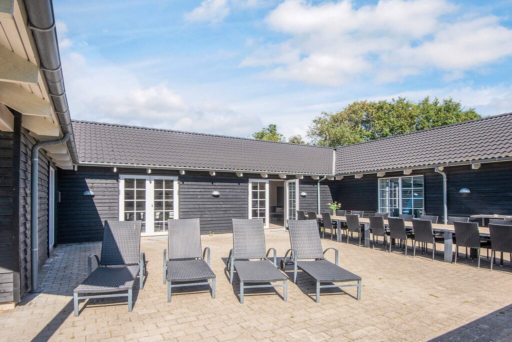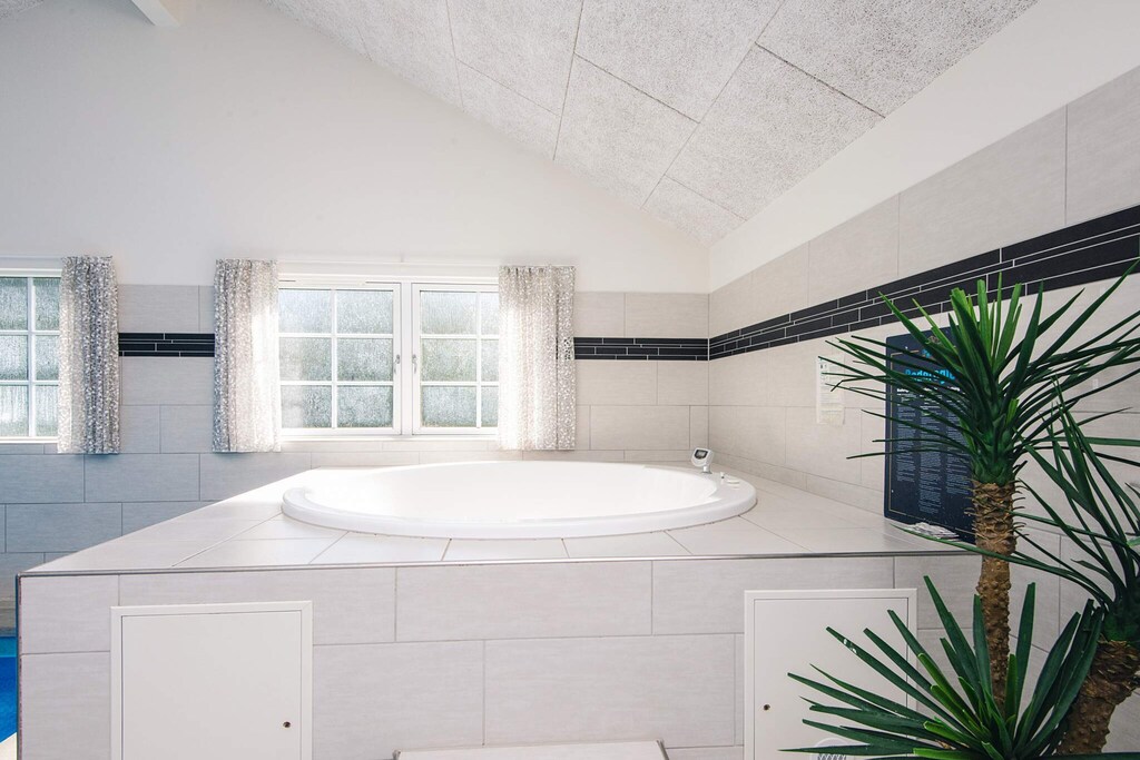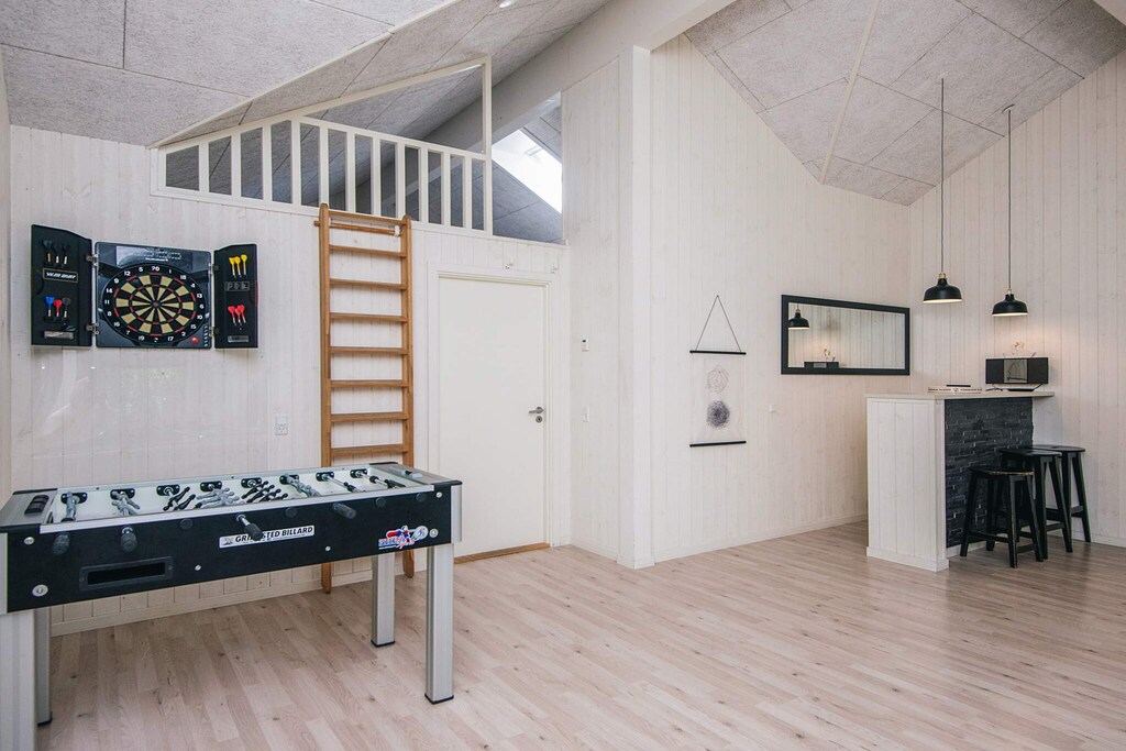 Large and well-appointed holiday cottage with lots of interesting details and activities centrally located i Blåvand. The pool area has both a large swimming pool with slide, large built-in whirlpool and a sauna. The pool is 20 m2 and has a slide for the children. There is a counter-current system in the pool. In the activity room you can play table football, billiards, electronic darts and table tennis. There are more TVs as well as PlayStation4 and blu-ray player. The house has an optimal layout with modern furnishings, is spacious and well-dimensioned and built around 3 separate sleeping areas. Each area has a bathroom and there is an additional bathroom near the swimming pool. Furthermore there is a large and spacious mezzanine. The large living room, with exit to the terrace, is the natural gathering point with a sofa area, dining section and kitchen. The well-appointed kitchen has a cooking island and double dish washer, sink, oven, fridge and cooker which makes it easy to prepare dinner. The large terrace with exclusive garden furniture and fireplace is perfect both for a summer day in the sun and for cosy barbecues with friend and family. For the children there is play tower, sandpit and trampoline (usage at own risk/insurance). No letting to youth groups.