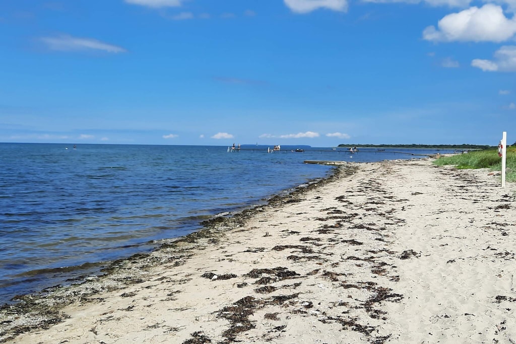 Holiday cottage located approx. 500 m from the ocean at Skåstrup water. Personalised decorated with modern furnishings. The house has simply everything the heart desires of activities and opportunities for development. There is a small ocean view from the kitchen. The house is very spacious and well-dimensioned and built around two separate sleeping sections. Each section has a bathroom and there is an additional bathroom in the pool area. A total of four bathrooms, all have underfloor heating. Geothermal heating throughout. Dining/living room is tastefully furnished with a stereo with CD player, flat screen TV, DVD player, high chair, living room and wood-burning stove. The house has 8 bedrooms. All rooms with double beds have box-mattresses. In addition, large and spacious mezzanine with TV and bean bags. In the activity room you can play billiards, electronic darts and table tennis. The kitchen has 2 fridge/freezers, 2 wash basins, 2 cookers with ceramic hobs and a dishwasher. The house has a pool area with both large a swimming pool, water slide, swim coach, large built-in whirlpool and sauna for 4-6 people. The swimming pool is 18m ² and has a slide for the kids. There is also a counter-current system so all week you can improve your fitness with daily strokes combined with pure relaxation in the whirlpool and sauna, located in the pool room. The crackling fire from the wood-burning stove can be enjoyed indoors for socialising. There are several televisions in various departments and DVD players. On the spacious plot that surrounds the house there are swings, and sandpit. Covered terrace of 15m2. There is a trampoline (usage at own risk/insurance). Payment for deposit must be paid in cash to the concierge at the house.