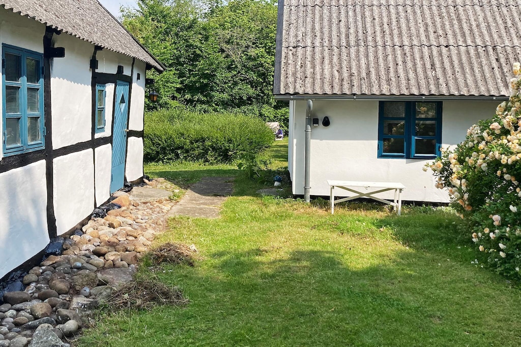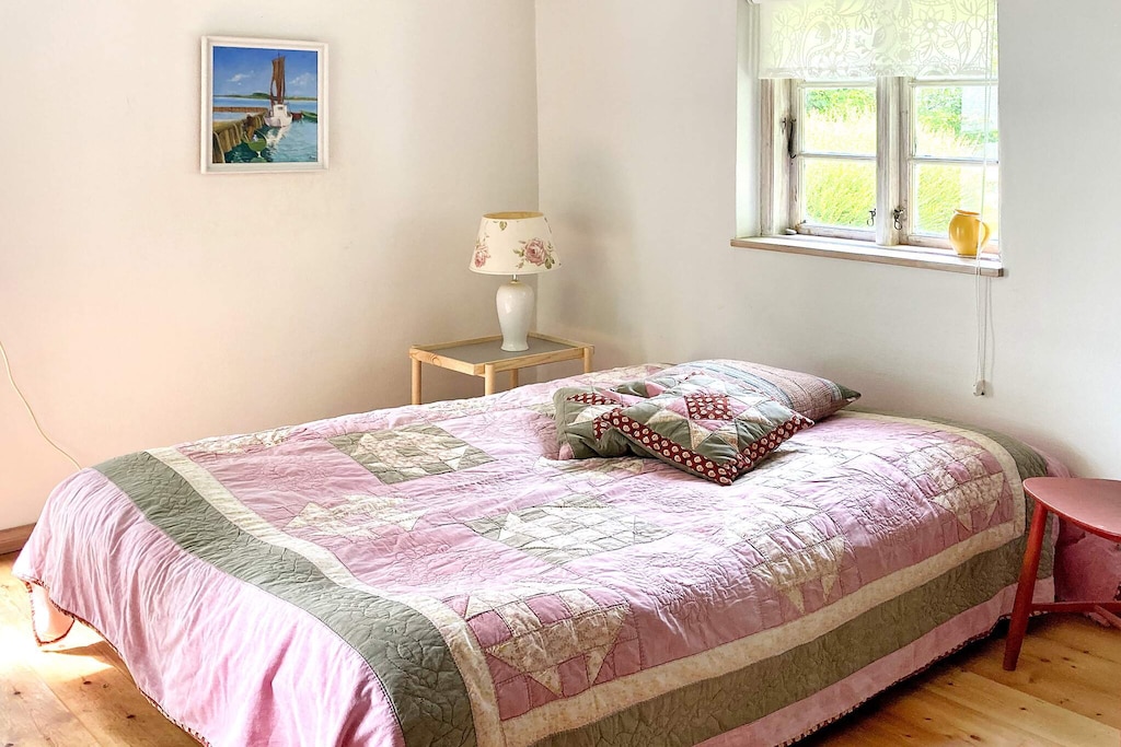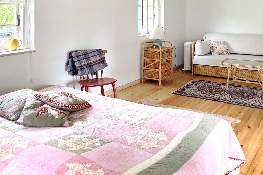 In the cozy Bogø town is this older cottage with barred windows. The house was built in the year 1800 and partially renovated in 2021. There are exposed beams throughout the house. The main house is 50 m2 and consists of an entrance hall, double bedroom and a nice large bathroom. From the entrance there is access to a small kitchen and from there on to the living / dining room with wood burning stove. Next to the main house there is a large annex of 35 m2 with two sofa beds and with exposed beams in the ceiling. In the immediate vicinity is Skåninge Bridge with the small charming marina, and the obvious place to swim in the child-friendly water with various bathing jetties. Not for rent to youth groups.