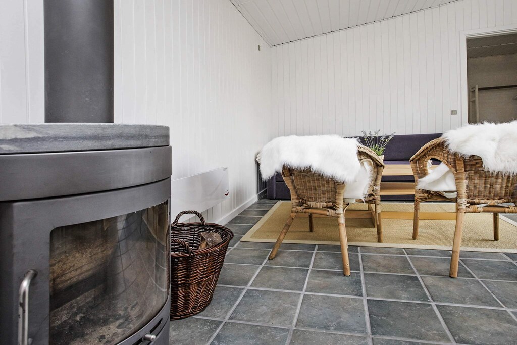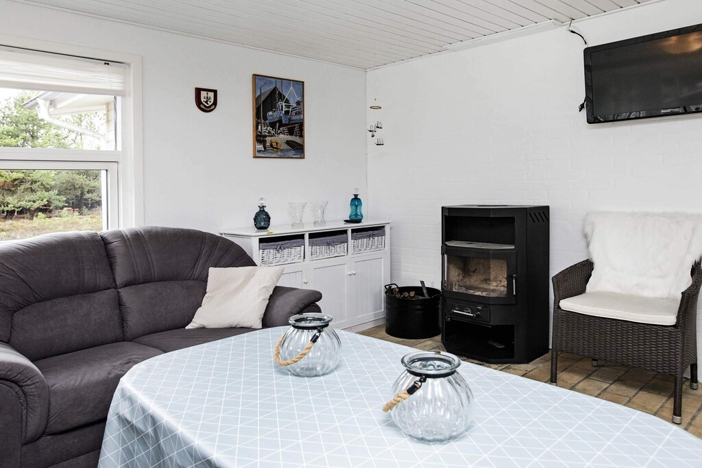 Well-kept cottage with a beautiful location only approx. 150 m from the lovely, child-friendly beach. The cottage is brightly decorated with open kitchen / living room, bathroom with underfloor heating, living room with wood stove, heat pump and direct access to large terrace, where you can enjoy the sun and relax in the garden furniture. There are a total of two living rooms, each with their own wood stove. Approx. 50 m from the house is a nice playground and grocery store.