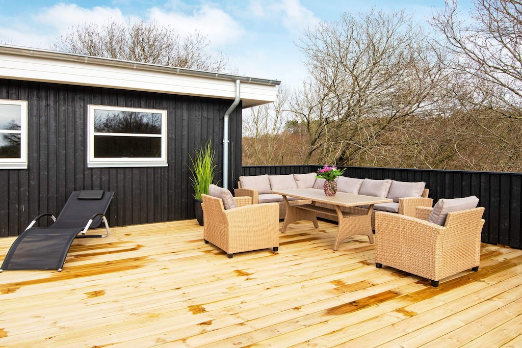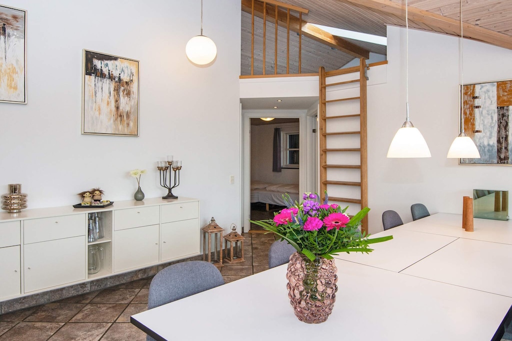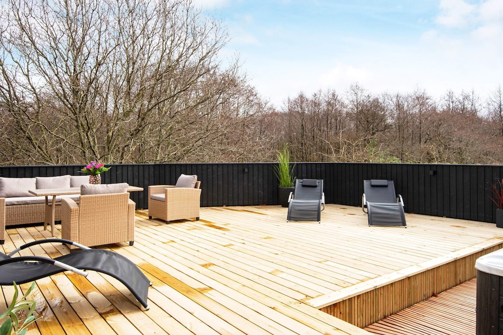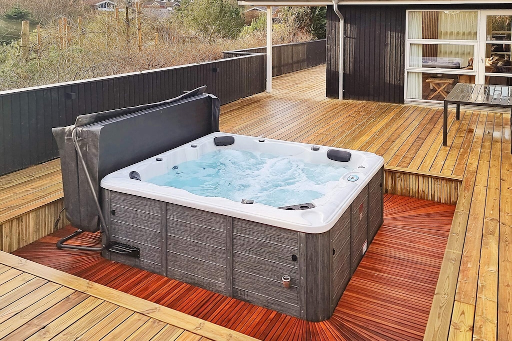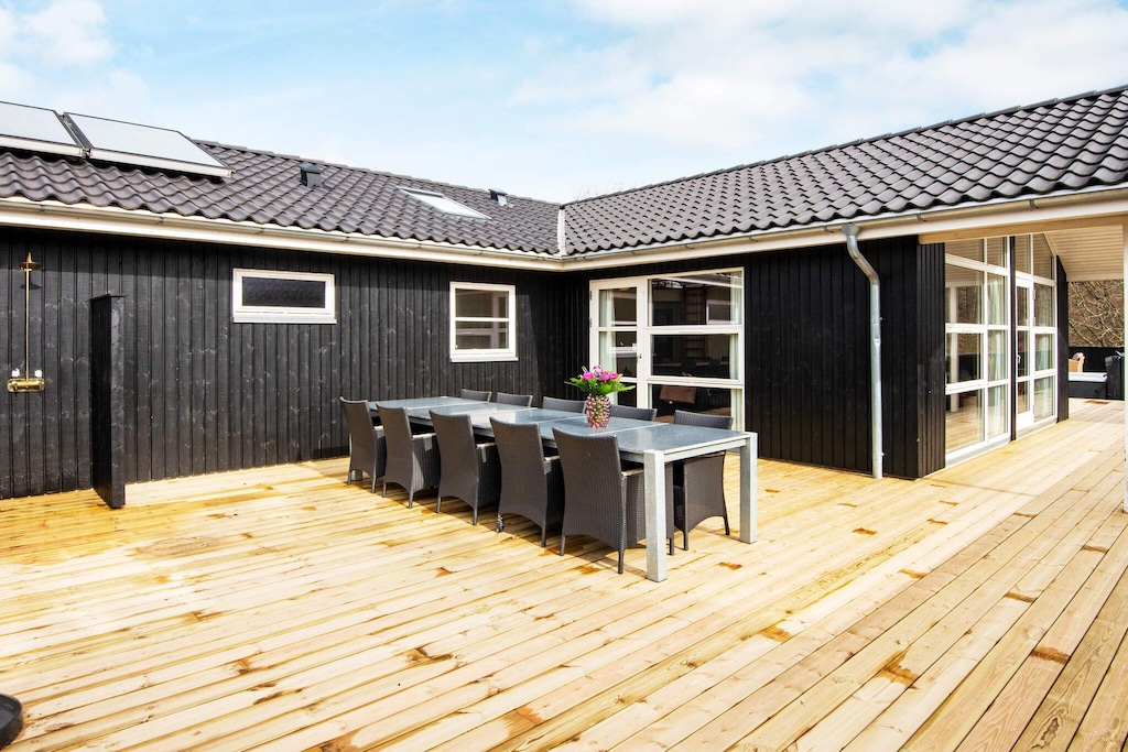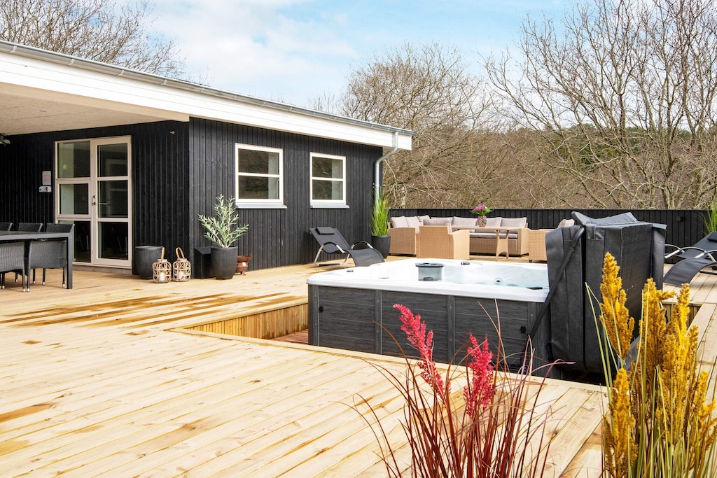 This spacious and well-equipped holiday home is perfect for large families or two families traveling together, offering plenty of space, comfort, and entertainment. Located in a popular holiday area near Lyngsbæk Beach, it combines wellness facilities with activities to create the ideal setting for both relaxation and fun. The home features a bright open-plan living area with a fully equipped kitchen and space for everyone to gather. There are four bedrooms, a loft under the sloping roof that’s perfect for kids, and a separate annex on the property, providing a total of 12 sleeping spaces. Guests can unwind in the bathroom’s spa bath and sauna or head outside to enjoy the large outdoor hot tub, added in 2021 and designed for up to six people. For those who love games and family competitions, the large activity room offers billiards, table tennis, and darts. Outdoors, a spacious lawn invites play and relaxation, while a partially covered terrace makes it easy to enjoy long summer evenings and barbecue dinners. The home also features an electric car charging station, ensuring convenience for modern travelers. Surrounded by scenic walking paths and close to the beach, this property is a fantastic base for exploring the beauty of the area. With plenty of space and thoughtful amenities, it promises a memorable holiday for families and friends alike. Please note the home is not rented to youth groups, ensuring a calm and welcoming environment for all guests.A refundable deposit might be charged closer to your check-in date. The security deposit ensures a smooth stay and covers any additional services or consumption charges.This deposit covers utilities consumed during your stay and any additional services that may be taken.The final amount will be adjusted based on actual meter readings, actual usage of extra services, and any remaining balance will be refunded within 21 days after checkout.This deposit simply acts as a prepayment for charges that you would anyways pay for, ensuring a seamless stay and check-out experience.