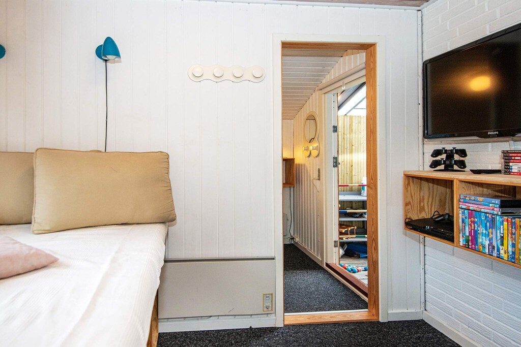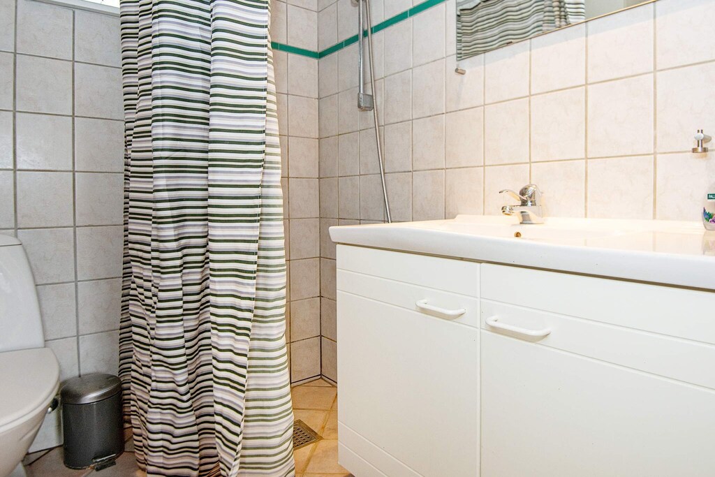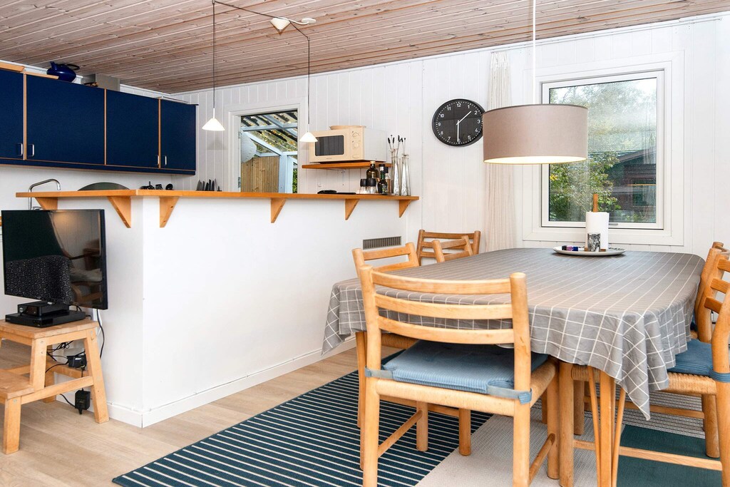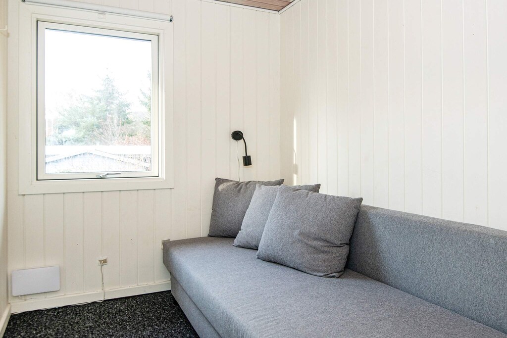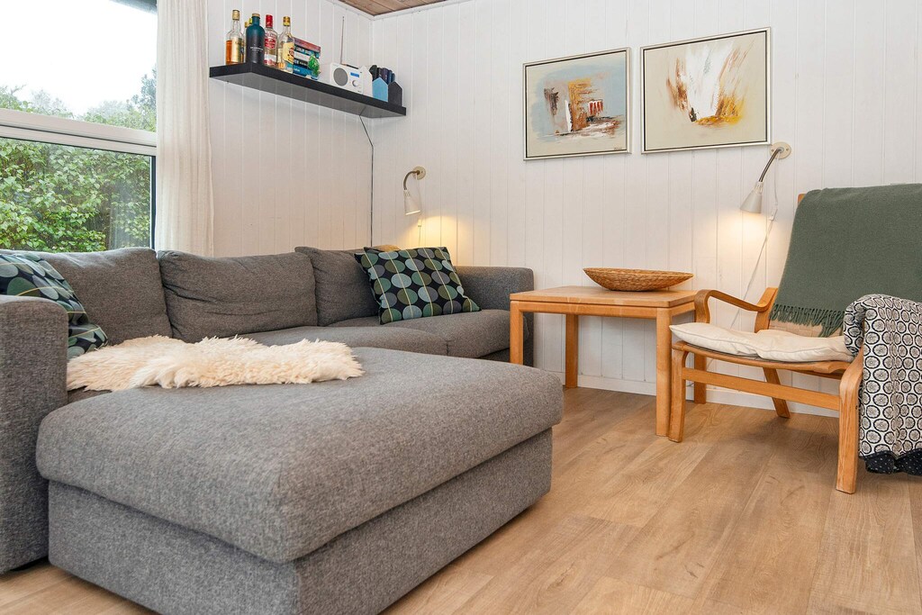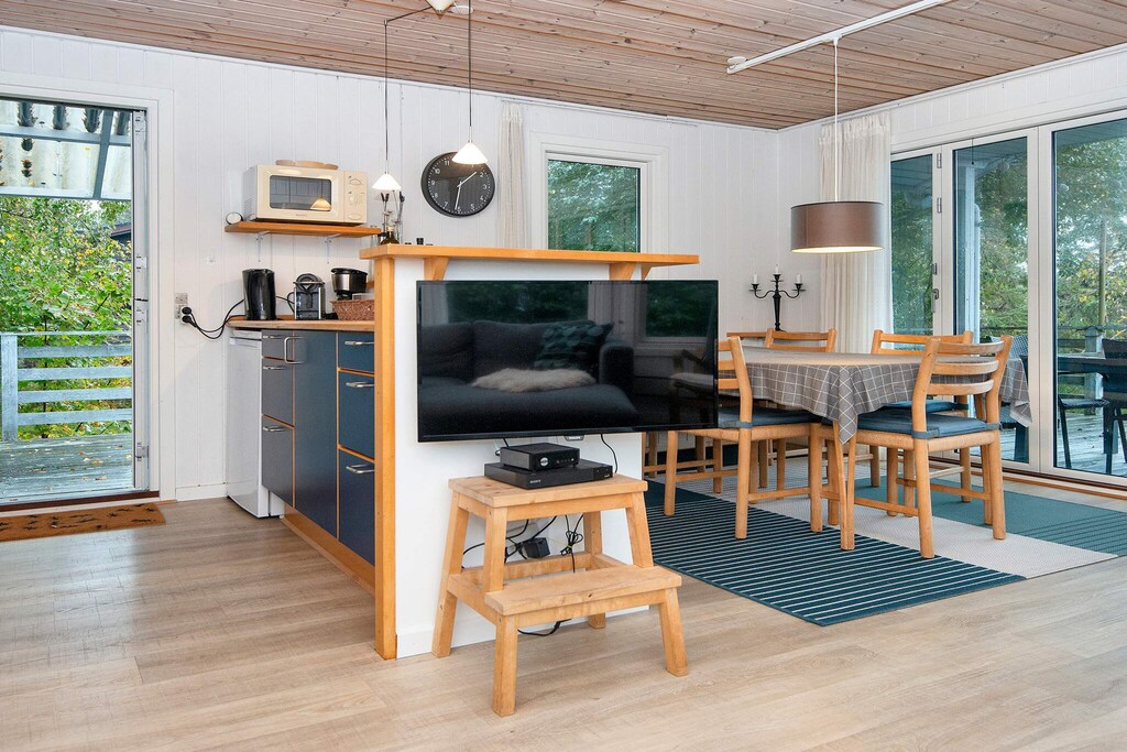 Cottage high situated on sloping, open plot with trees. In the garden there is a trampoline for the children so they can jump and play (use of this is at the tenant's own responsibility / insurance), there is also a large playhouse with climbing wall and swing on the plot. The house has a good decor with i.a. good kitchen / living room in open connection with the living room. The washing machine is in an outbuilding. There are several good terraces so the sun can be enjoyed all day. The evening sun can be enjoyed on the large covered terrace, where there are also nice views of the area. The house is heated with electricity and wood stove. Not for rent to youth groups.