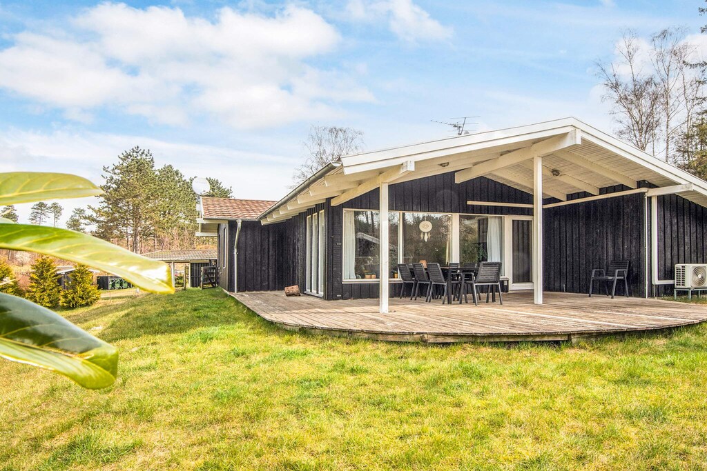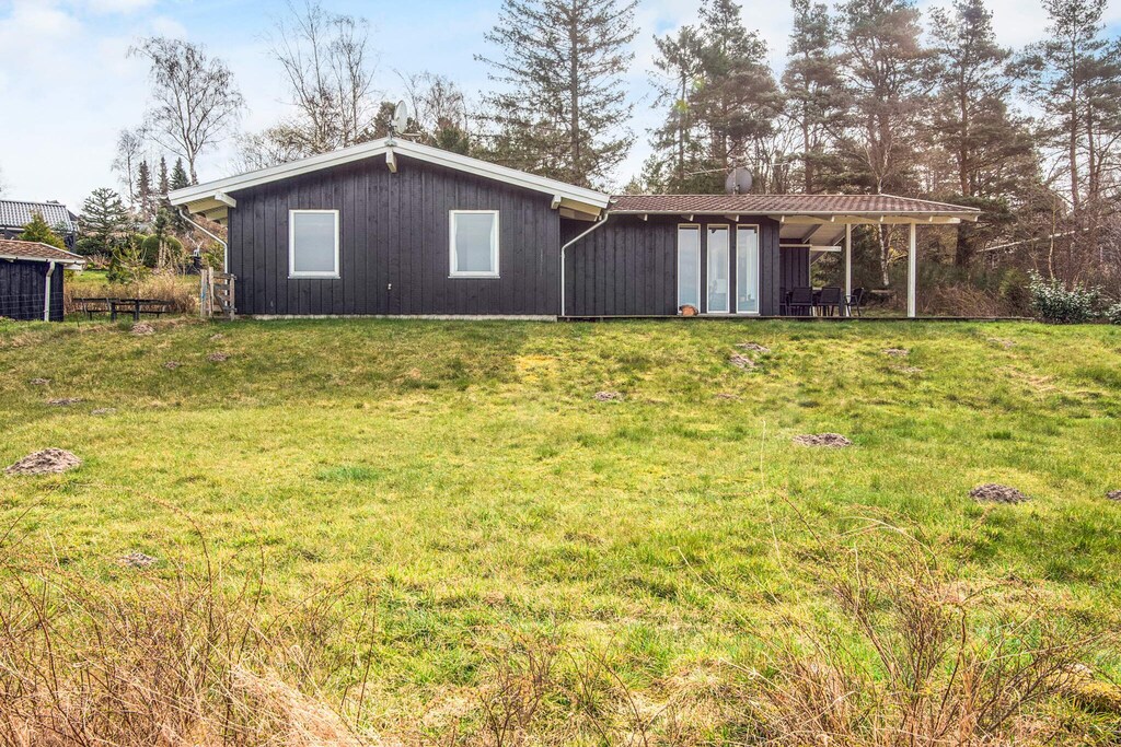 Holiday home with sauna located on a fenced plot and with a very beautiful view of fields and trees at Handrup Bakker. The area is full of opportunities for good hiking and animal experiences. After a long walk, the muscles can be warmed up in the house's sauna. Outside there is a carport for the car and at the back of the house there is a lovely terrace where the sun can be enjoyed. There is also a large, covered terrace at the end of the house, where you can stay regardless of the weather. Here you can also cook on the grill for the cozy barbecue evenings. Not for rent to youth groups.