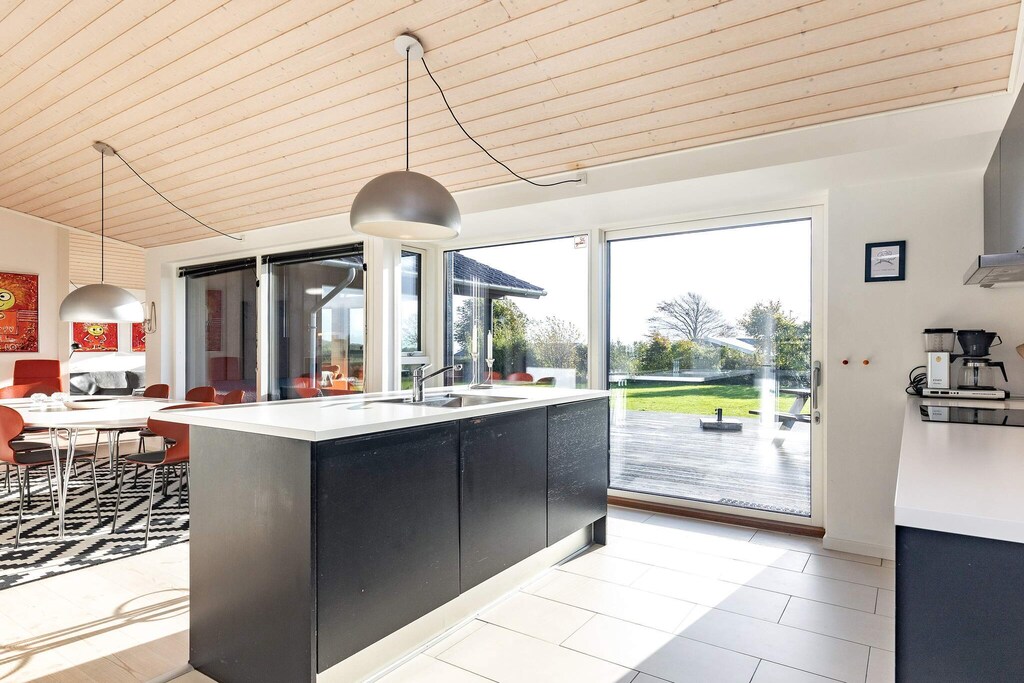 Holiday cottage with great views of the ocean from both house and plot. You can see the small islands Lyø, Avernakø and Als from the house. The plot is close to a large natural area with various animals. Wooden floors or tile floors with underfloor heating throughout the entire house. There are also air-to-air heat pump and a wood-burning stove which provides a comfortable heating during the cold months. Large bathroom with 2-persons whirlpool and a sauna for 4 persons. Combined living and dining room with access to the terrace. The living room has a large flatscreen-TV, DVD player, radio with CD player and a PlayStation. The fully equipped kitchen has i.a. fan oven and microwave oven. 4 bedrooms at either ends of the house and a large mezzanine overlooking the kitchen-family room. Large, open and covered terrace with grill. The garden has football goal, sandpit, swing set and various games. Approx. 200 m from the house is a child-friendly beach. A refundable deposit might be charged closer to your check-in date. The security deposit ensures a smooth stay and covers any additional services or consumption charges.This deposit covers utilities consumed during your stay and any additional services that may be taken.The final amount will be adjusted based on actual meter readings, actual usage of extra services, and any remaining balance will be refunded within 21 days after checkout.This deposit simply acts as a prepayment for charges that you would anyways pay for, ensuring a seamless stay and check-out experience.