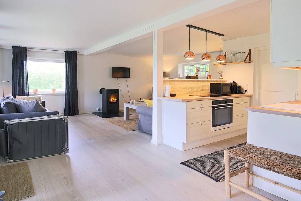 Holiday home close to Gilleleje, the water and walks in the area. The house has a bright and functional kitchen with access to a large tiled terrace with evening sun. The kitchen is in open connection with a good dining area and a cozy nook and contains i.a. ceramic hobs, fridge / freezer and dishwasher. Bathroom with shower and underfloor heating. Living room with double sofa bed, internet, TV with Chromecast, air / air heat pump, pellet stove and with a nice view out to the terrace and garden through the large windows. Spacious double bedroom, exit to the front garden and utility room with washing machine. The garden has plenty of space for barbecues, fun and games. Here are several terrace areas and an enclosed patio that is ideal for cosiness in the evening. There is an outdoor fireplace. The cottage is located in a cottage area on the outskirts of Gilleleje, within walking distance to the beach path, which leads down to the beach, the harbor and the town, which offers cafe life and shopping. Not for rent to youth groups.