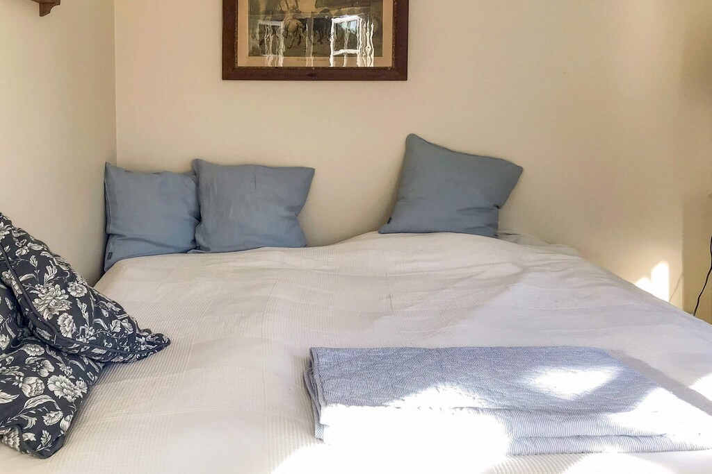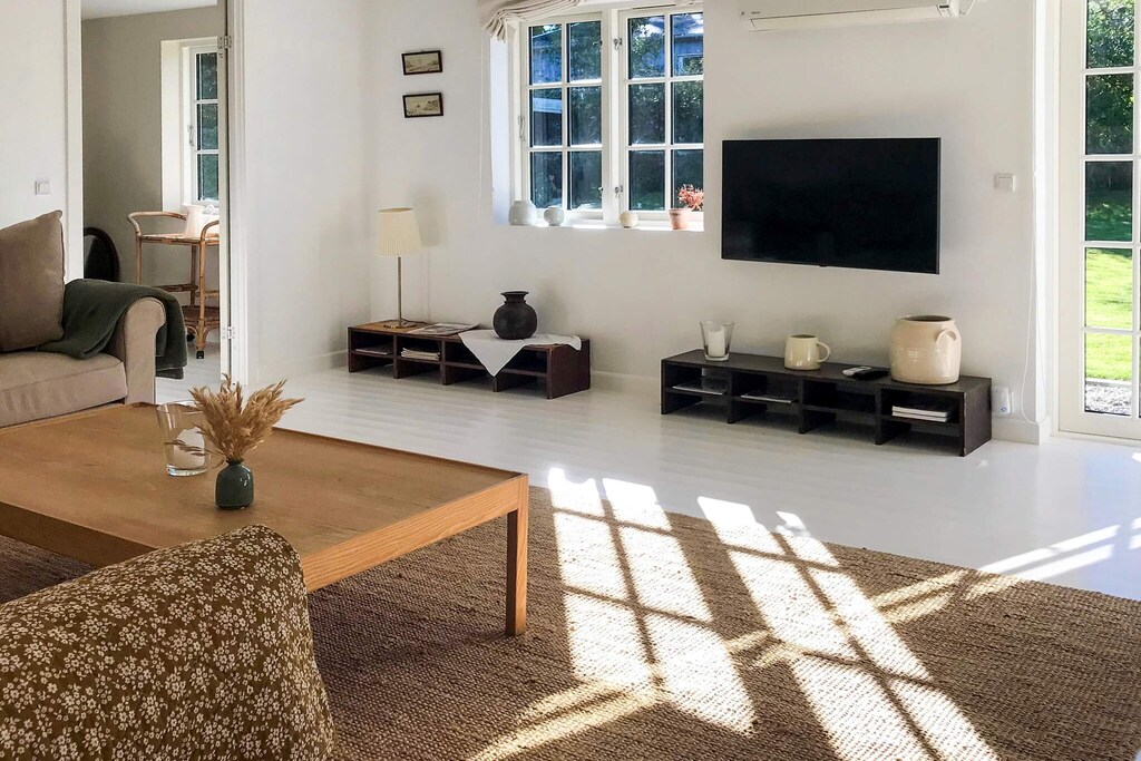 Ankom til et gennemkoldt sommerhus og mÃ¥tte den første ½ time slÃ¥s med at finde ud af hvordan luft/luft varmen fungerede, Det samme gjaldt tv og gulvvarmen pÃ¥ toilettet, som der heller ikke var nogle forklaringer eller manualer til, SÃ¥ første dag i sommerhuset var kold, Kan ikke anbefales som leje i de kolde mÃ¥neder, / Trods at der stod at haven var indhegnet, sÃ¥ var det med store huller i hækken ud mod vejen og derfor turde vi ikke lukke vores hunde ud i haven, Godt det samme, for den var fyldt med store hundelorte, trods det stod i afleverings papirerne at den skulle rengøres ved fraflytning, / Køkken sortimentet var et underligt sammensurium af forskelligt bestik og tilbehør, Desværre ingen mikrobølgeovn, Og isterningsmaskinen som skulle være i køle/fryseskabet var "bare" alm, isterningebakker ! / / Men ellers var det et pænt lille sommerhus, LÃ¥ langt ude i skoven sammen med en masse andre sommerhus, hvorfor der ogsÃ¥ var en del trafik pÃ¥ vejen, / Ãnsker man at bruge pejsen, kan det anbefales at købe træ med hjemmefra, Vi havde meget besvær med at finde brænde til salg i omrÃ¥det, / / 3 gode ting ved sommerhuset : / 1, Pænt sommerhus / 2, God beliggenhed / 4, Gode senge, / / 3 dÃ¥rlige ting ved sommerhuset, / 1, Manglende vejledninger til de tekniske installationer, / 2, DÃ¥rlig rengøring i køleskab, køkken og bad, / 3, DÃ¥rlig indhegnet have, med alt for mange hundelorte,