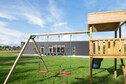 Stort hus med mye utstyr, nytt og fint, klatre- og huskestativ utenfor.