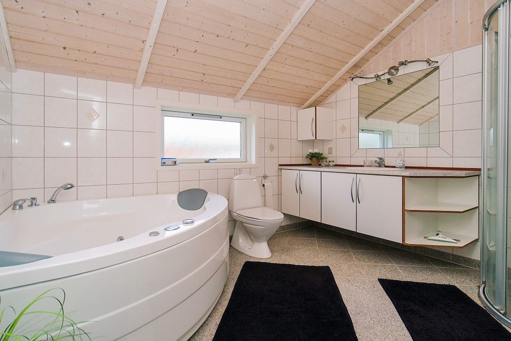 Holiday home with whirlpool on natural plot only approx. 200 meters from the sea at Dalby Strand. The house has an open as well as a covered terrace with garden furniture. There are light wood walls and ceilings. Wooden floors with partially loose carpets. The house is furnished with bathroom with underfloor heating, shower and 2-person whirlpool. Modern, well-equipped, open kitchen in connection with the living room with i.a. freezer, dishwasher, microwave, convection oven and hob with ceramic hobs. There is a large living room furnished with a large glass part, which makes the living room nice light. The living room is i.a. equipped with air conditioning, TV, video and stereo with CD player. The house sleeps in three bedrooms. In the small utility room there is a washing machine. Not for rent to youth groups.