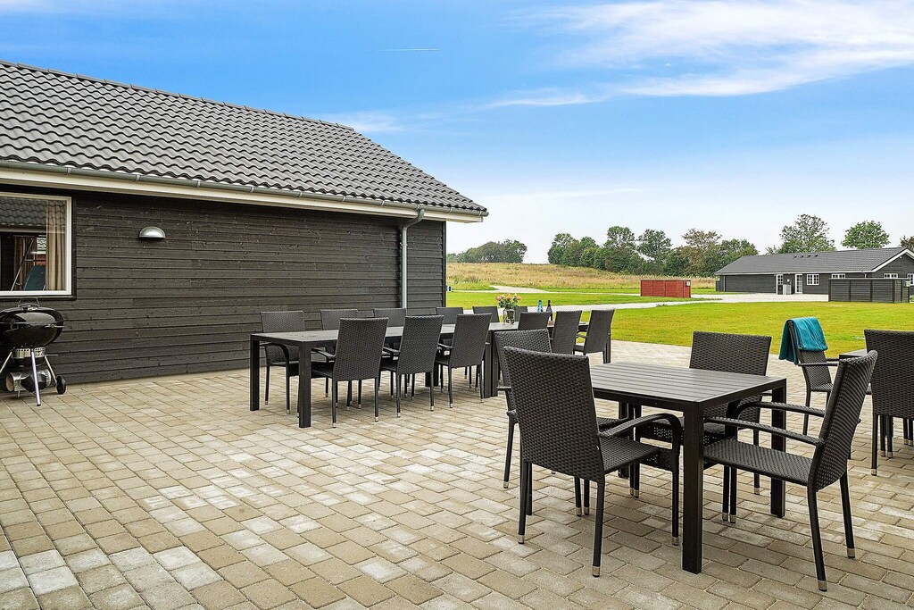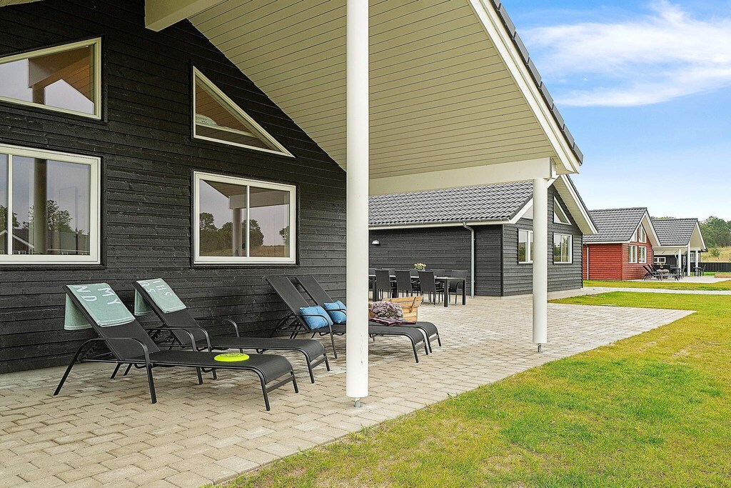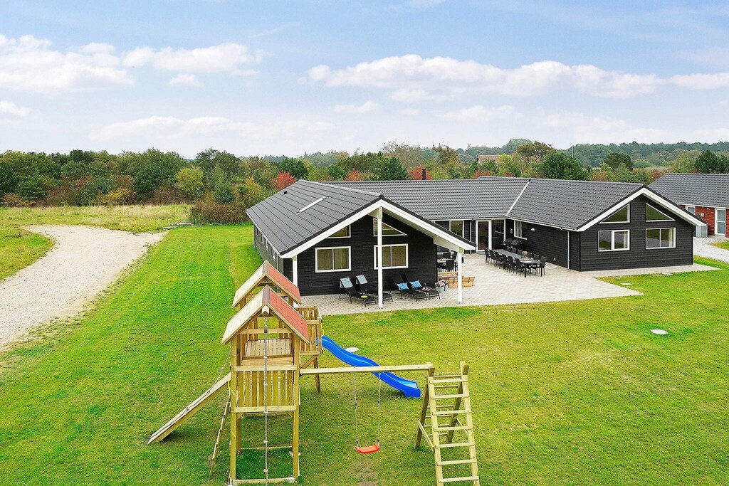 This well-appointed holiday cottage with swimming pool, whirlpool and sauna as well as various activities is located approx. 1200 m from the ocean at Grenå Strand. The pool area has a 20 m2 large swimming pool with water slide, counter-current system, large whirlpool and sauna for 4-6 persons. Here both kids and grown-ups will probably spend many hours frolicking in the water. In the activity room you can play table football, billiards, electronic darts and table tennis. There are TVs in various areas of the house as well as PlayStation4 and a blu-ray dvd-player and chromecast Personal decor with modern furnishings. The living/dining room is tastefully furnished and has stereo set with CD player, TV, high chair, sofa area and a wood-burning stove. The well-assorted kitchen has i.a. large fridge, freezer as well as 2 dish washers and 2 cookers making cooking for the large family easy. The house is very spacious and built around 2 separate sleeping sections. Each section has its own bathroom and there is an extra bathroom near the pool area. There are furthermore 2 mezzanines of which one is perfect for the children to enjoy. On the plot you will find swing, sandpit and trampoline (usage at own risk/insurance). On the west-faced terrace you can enjoy the sun all day. Payment for consumption, and deposit must be in cash to the landlord at the house. No letting to youth groups. Please note that the photos are taken from a similar house as it is under construction.