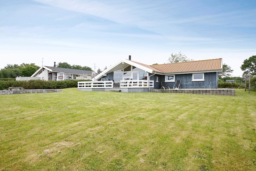Great location overlooking Kattegat. Large and spacious house with plenty of space indoors and outdoors. The layput makes it ideal for 2 families sharing. The house is modern performed with many interesting details and functionally furnished. Kitchen/dining area with all appliances. Decorated with nice bedrooms with box mattresses that can be double or single. The living room is spacious with eg wood-burning stove that makes the dark nights extra cosy. Large living room combined with dining and kitchen area. Large bathroom with whirlpool. Terraces around the house and a large lawn for ball games with play equipment. No letting to youth groups.