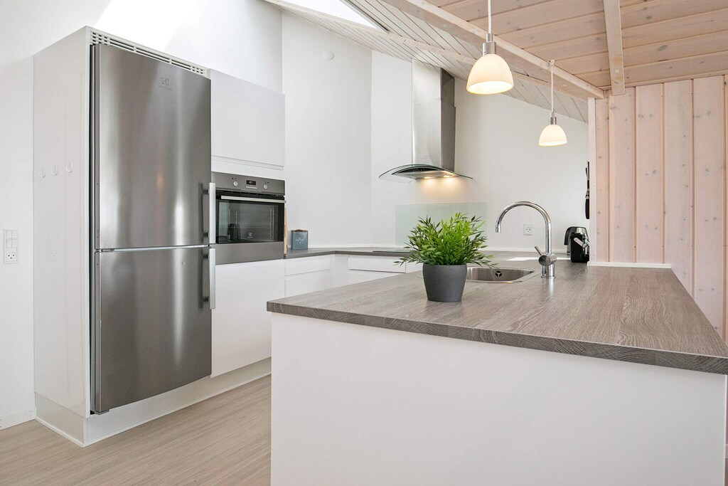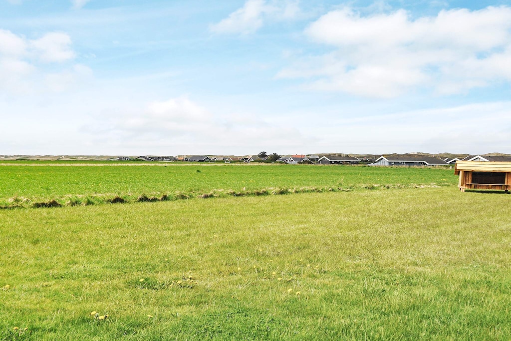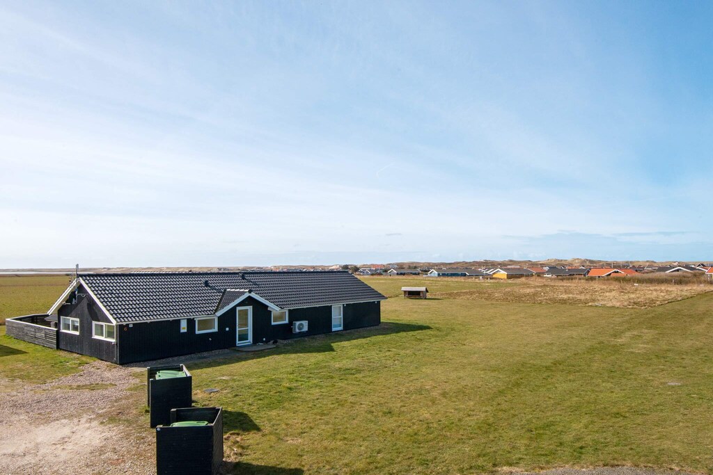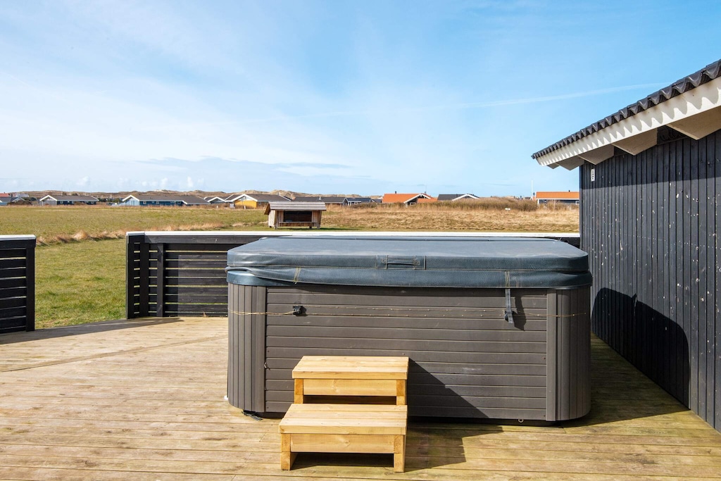 By Vejlby Klit is this completed cottage with outdoor whirlpool and an absolutely fantastic location as well as a beautiful view of Ferring Lake. The cottage is at one end furnished with a large activity room with pool table and table football, large bright bathroom with access to sauna and two bedrooms with double beds. In the heart of the house is the large kitchen / living room with dining area, sofa group with flat screen TV and wood stove and an alcove with sleeping accommodation for two people. At the opposite end of the house are two more bedrooms and a bathroom with shower and sauna. On the large wooden terrace is the seven-person large outdoor hot tub, from which there is a view of Ferring Lake and Bovbjerg Lighthouse. The terrace is closed so you can sit in the shelter and enjoy the silence, which can be interrupted by the sea waves crashing against the shore. There is a shelter in the garden of 2 x 2.5 meters to spend the night in, if you are up for it. Not for rent to youth groups.