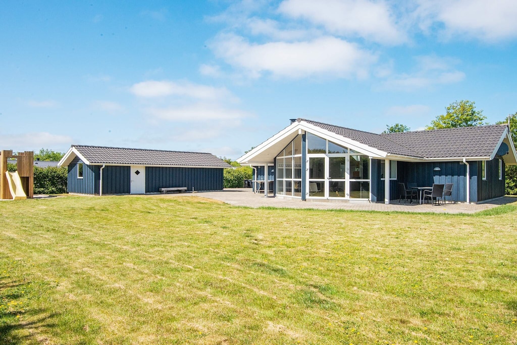 Unusual holiday cottage characterised by its good layout and craftsmanship standards. The whole house is perfectly utilised and decorated with modern furniture. After a long day there is plenty of room in the 2-person large whirlpool. The house has an energy-saving heat pump in the house. Direct access to the sauna. For children there is a playground, play set, slide, climbing wall, swings and large sandpit. There is also outdoor kitchen. The large lawn is suitable for ball games. On the 115 m² terrace you have space for sunbathing or a barbecue. No letting to youth groups.A refundable deposit might be charged closer to your check-in date. The security deposit ensures a smooth stay and covers any additional services or consumption charges.This deposit covers utilities consumed during your stay and any additional services that may be taken.The final amount will be adjusted based on actual meter readings, actual usage of extra services, and any remaining balance will be refunded within 21 days after checkout.This deposit simply acts as a prepayment for charges that you would anyways pay for, ensuring a seamless stay and check-out experience.