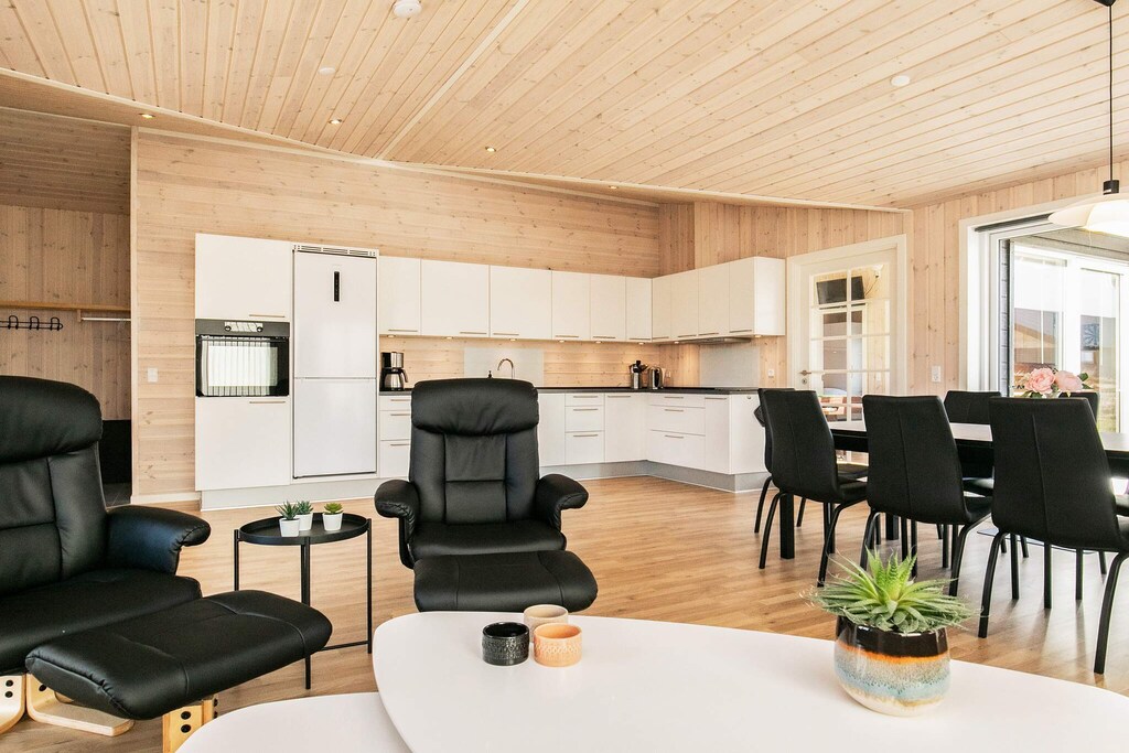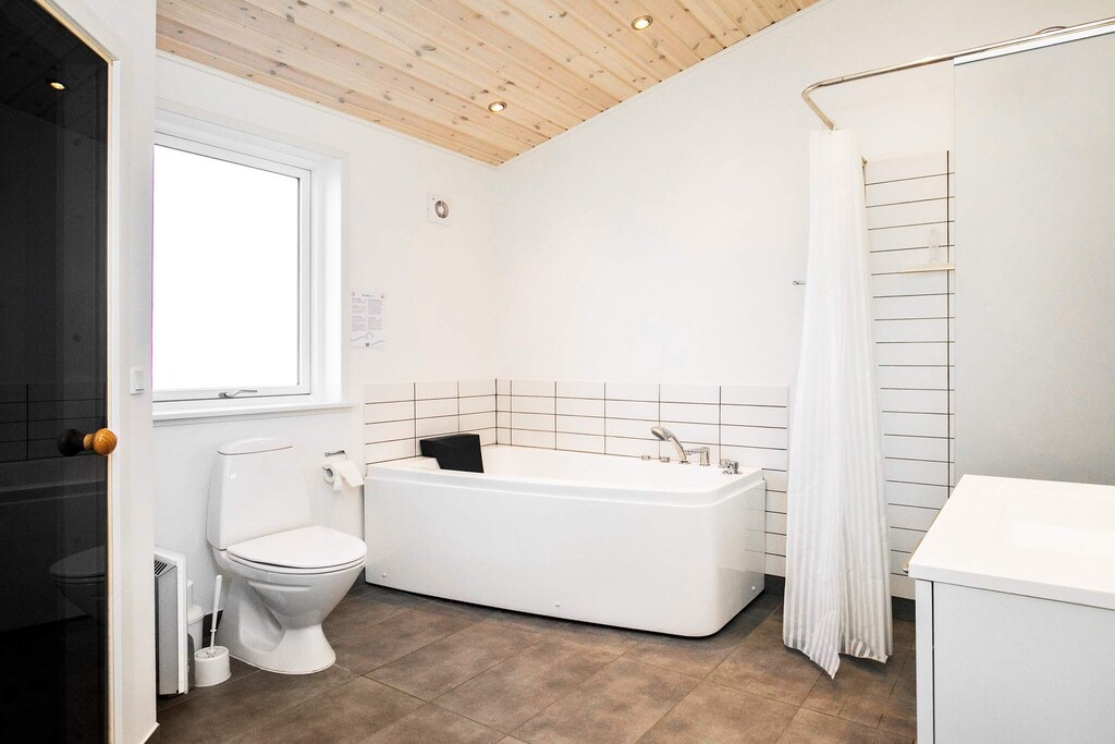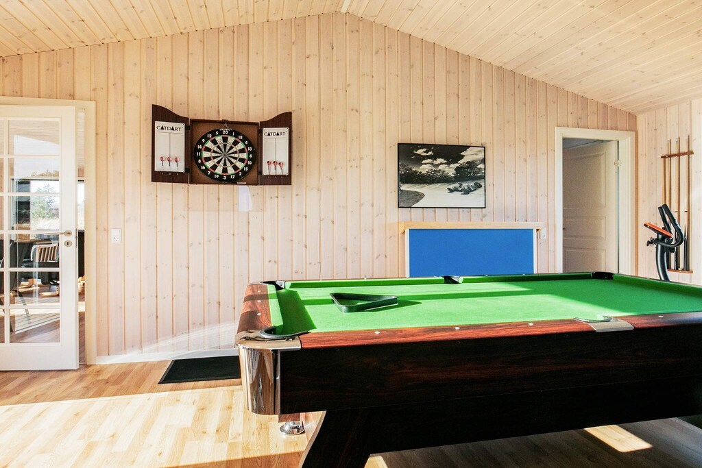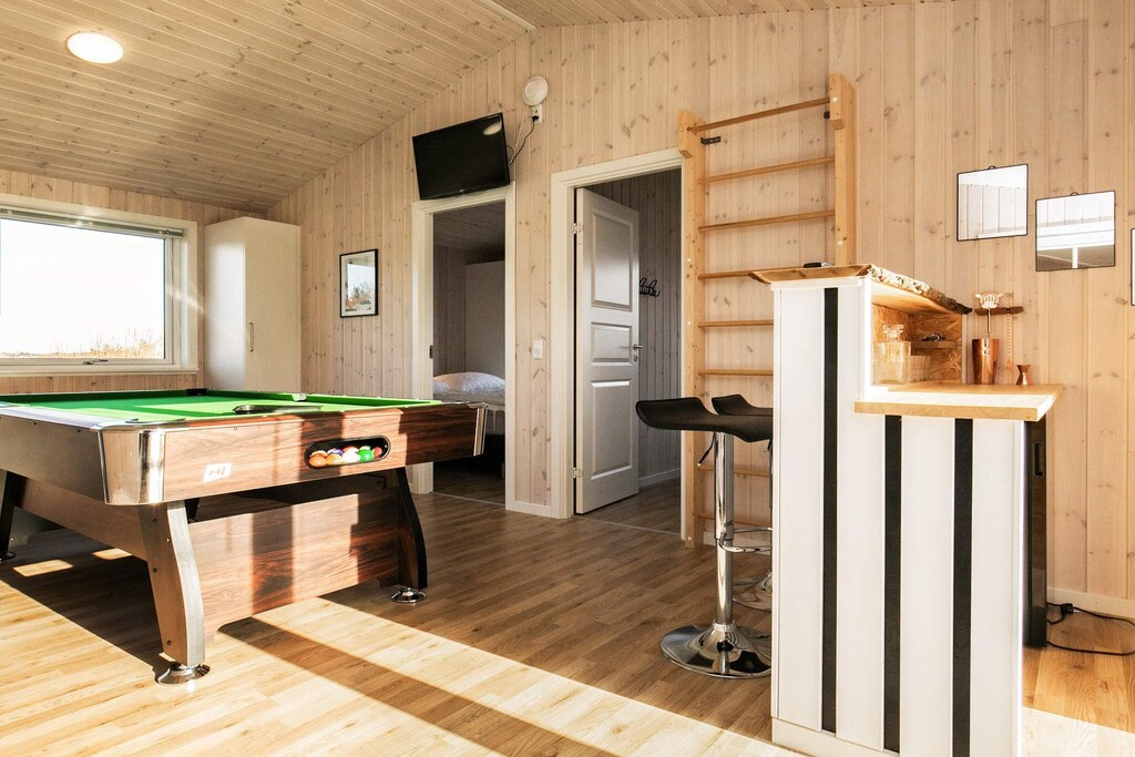 In Tornby close to the fascinating North Sea with the most beautiful white beach you will find this cottage with whirlpool and sauna as well as lots of light from the many large windows and a fantastic location on a large and beautiful natural plot. The ideal holiday home for the large family who wants lots of activities, good facilities and the most cozy holiday home atmosphere. The cottage is tastefully decorated, modern and well-appointed. The house is equipped with a good activity room with both a pool table, darts, as well as a table that can be placed on the table to play table tennis. The pool table is 195 cm x 110 cm. There is a bar with a wine fridge and thus a guarantee for many fun hours. The style is modern and functional. There are four large, bright bedrooms with good beds and closet space. The beds measure 160x200 cm. Two good bathrooms with shower and underfloor heating, one of which has a whirlpool and sauna for cozy moments. The heart of the cottage consists of a large and open living room with good acoustics in connection with the well-equipped kitchen. Washer and dryer are located in the utility room. The cottage has an electric fireplace. There is room for everyone to meet and enjoy cooking, meals, games, a good movie, etc. The room has several windows, so the fascinating, North Jutland light flows in, and on hot days you can open up to the terrace. Not for rent to youth groups.
