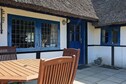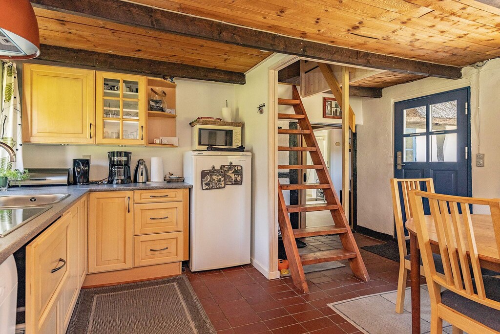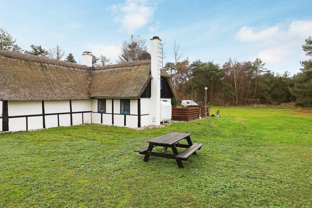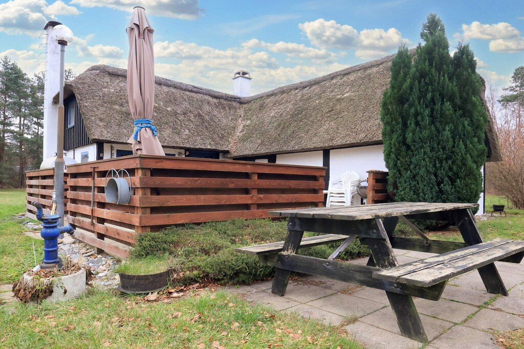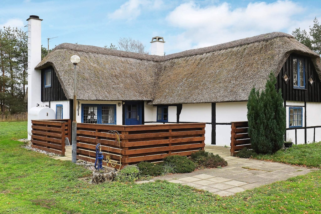 Charming cottage with thatched roof located in pure country idyll on Læsø in scenic surroundings on a large grassy area with trees completely undisturbed, close to the island's beautiful beach, forest for walking and the harbor environment. The cottage is furnished with three good bedrooms, a bathroom with bath, separate kitchen and living room with wood stove, heat pump and dining area. There is the possibility of ball games or barbecue on the terrace of the house overlooking unique nature with lots of wildlife and houses with seaweed roofs.