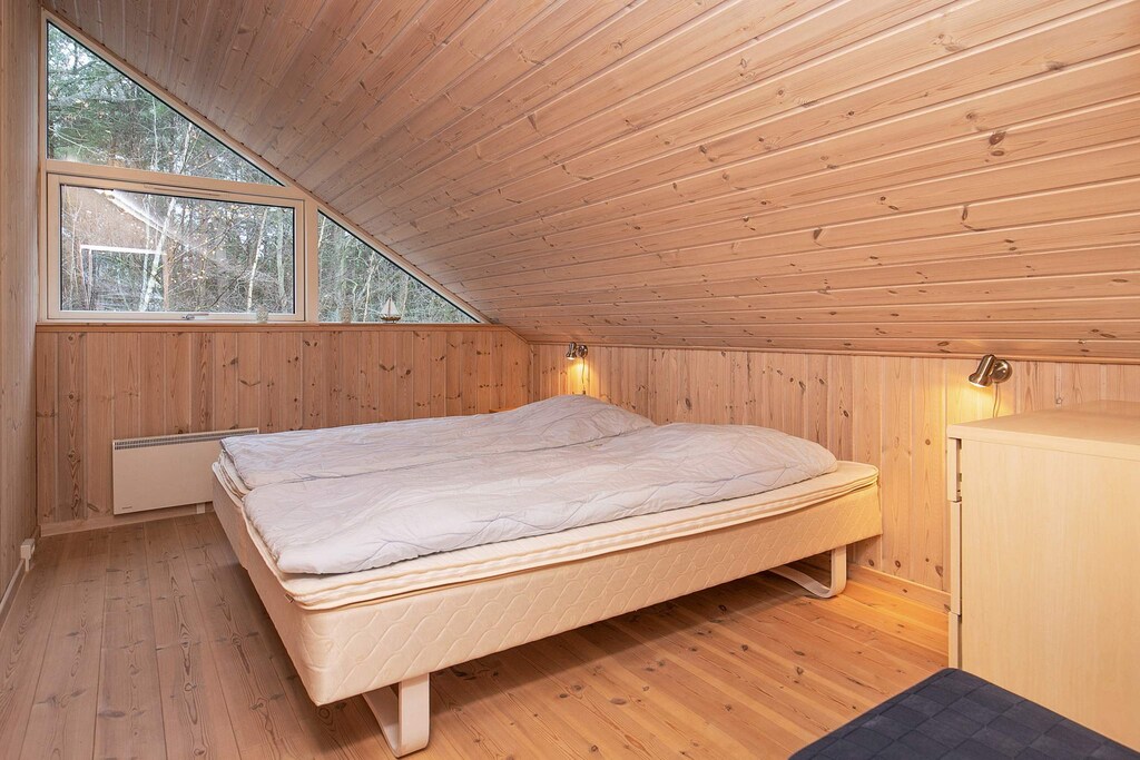 Completely unique and exciting architect-designed 8-sided cottage with large, bright and well-appointed rooms and large windows facing a lovely secluded natural plot with oak, birch and ferns located close to Byrum. The cottage is well furnished ground floor with large bathroom with shower, underfloor heating and sauna, guest toilet and large, well-appointed living room / kitchen with very good dining area, ceiling to kip and wood stove. Exit to southwest facing terrace. There is a large bedroom and a room with two beds. 1st floor has repos and two large bedrooms. The location is undisturbed, on the edge of a quiet forest area with the possibility of i.a. mushroom hunting between deer and pheasants. In addition, there is a sandpit and a carport with shed.