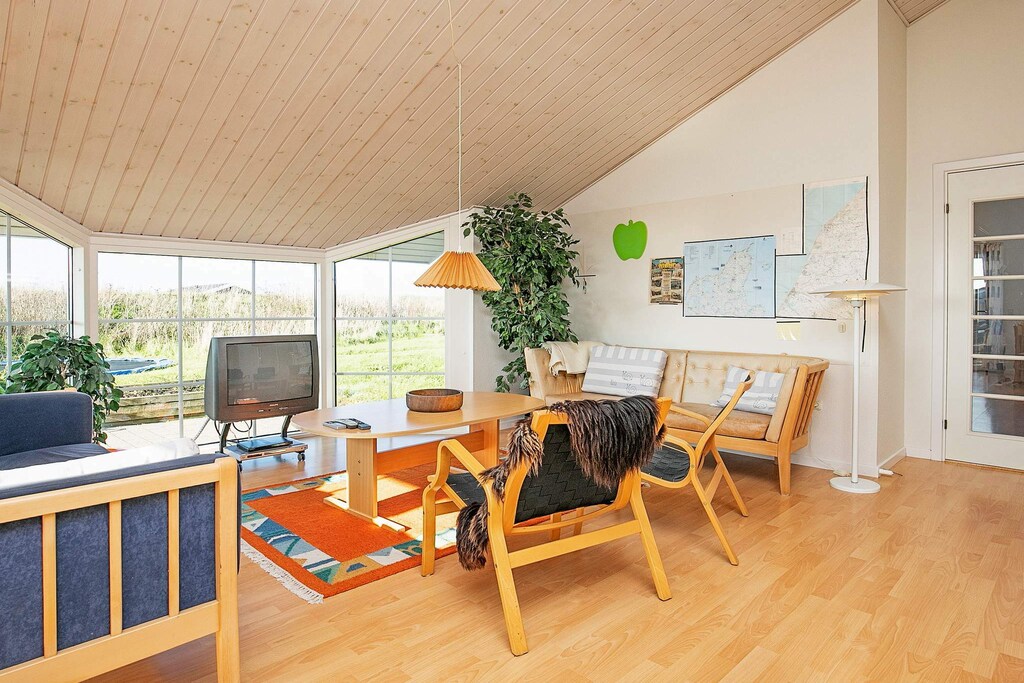 Modern holiday home located on a large, open natural plot in a scenic holiday home area a little north of Løkken. The cottage was built in 2002, continuously maintained, bright and spacious and very well furnished with four bedrooms, bathroom with whirlpool and access to sauna and guest toilet. Furniture and decoration are in Danish design. From the living area there is direct access to the terrace area, which almost has the character of a solarium and is completely undisturbed and well sheltered. For the children there is a buried trampoline (used at your own risk / insurance). In the area there is a common ball field with football goals. Not for rent to youth groups.