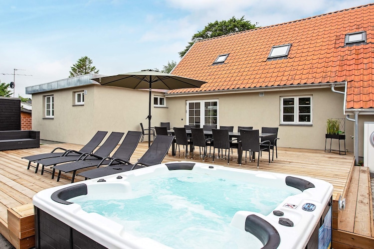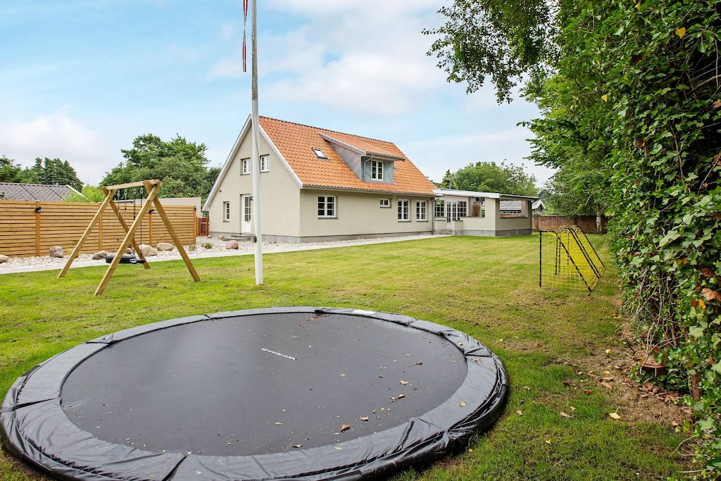 In the middle of Marielyst and a few steps from Marielyst center and square, this completely renovated cottage is just about 100 meters from the water. There is an outdoor hot tub as well as a sauna and activity room with i.a. table football, Wii and darts. The cottage is bright everywhere with modern furniture. The kitchen is open with i.a. ceramic hobs, separate oven, extractor hood, American fridge and freezer as well as dishwasher. The house is with underfloor heating throughout. Cot and high chair available. The bed distribution in the house is with three bedrooms in both the lower floor and the upper floor divided into three with double beds and three with single beds. Downstairs there are two bathrooms with shower, toilet and sink. On the 1st floor there is a toilet and sink. In the middle of the house you will find the cozy dining area with space for everyone around the table and look into the living room with bio fireplace and TV. There is also an air / water heat pump and free Wi-Fi. Exit to the one cozy terrace which is both covered and open. At the back of the house, where there is also a terrace, is the outdoor hot tub, where you can spend many hours in the hot water. By the terrace is the annex, which has an activity room and sauna and bathroom with shower, toilet and sink. Garden grill available. For the little ones there is a trampoline (at your own risk / insurance), swing, football goal and sandpit. Free access to water parks Falster and Nordfalster. Not for rent to youth groups.