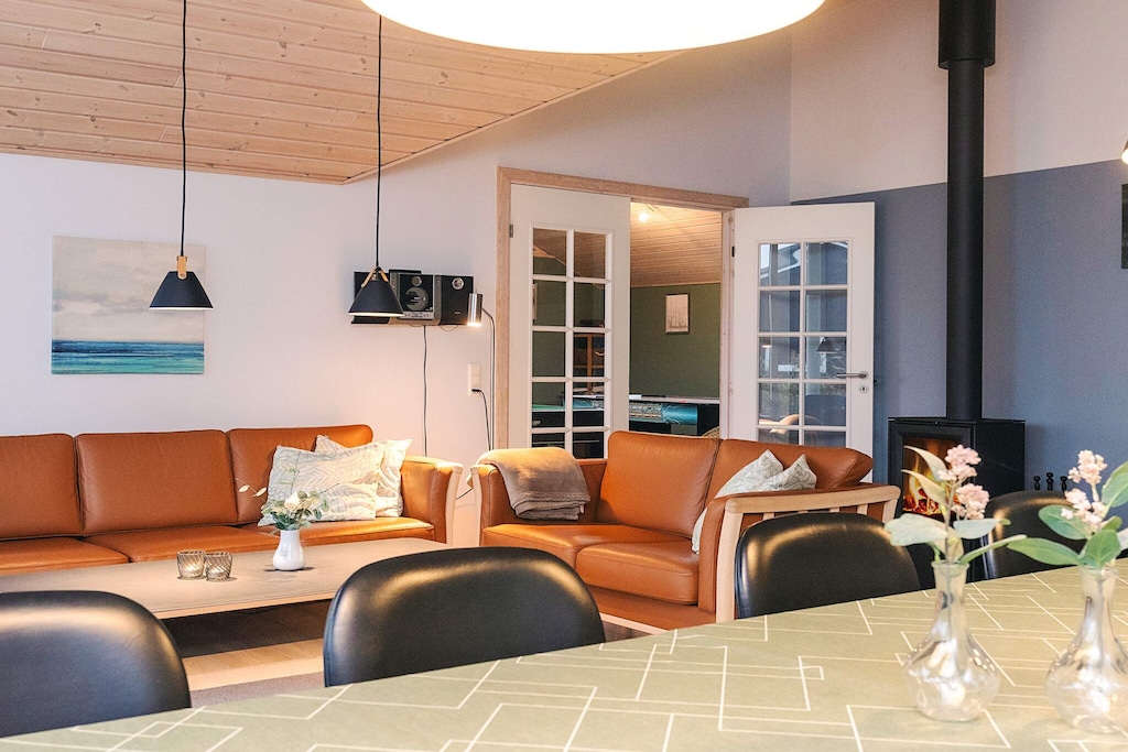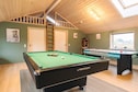On a large natural plot you will find this holiday cottage. The house is well furnished and offers everything the heart desires of activities and opportunities for development. Tastefully decorated living room with cosy furniture, wood-burning stove and flat screen TV. In the 30 m² activity room there are opportunities to challenge each other in a game of pool or table tennis. The house has two bathrooms, one of which is equipped with 6 person whirlpool and sauna. On the spacious grounds that surround the house there are swings and sandpit. Similarly, the house is equipped with a cot and highchair. If the weather fails, you can enjoy yourselves in the living room in front of the wood-burning stove. Due to the size of the house the price for final cleaning deviates from the normal listed price.A refundable deposit might be charged closer to your check-in date. The security deposit ensures a smooth stay and covers any additional services or consumption charges.This deposit covers utilities consumed during your stay and any additional services that may be taken.The final amount will be adjusted based on actual meter readings, actual usage of extra services, and any remaining balance will be refunded within 21 days after checkout.This deposit simply acts as a prepayment for charges that you would anyways pay for, ensuring a seamless stay and check-out experience.