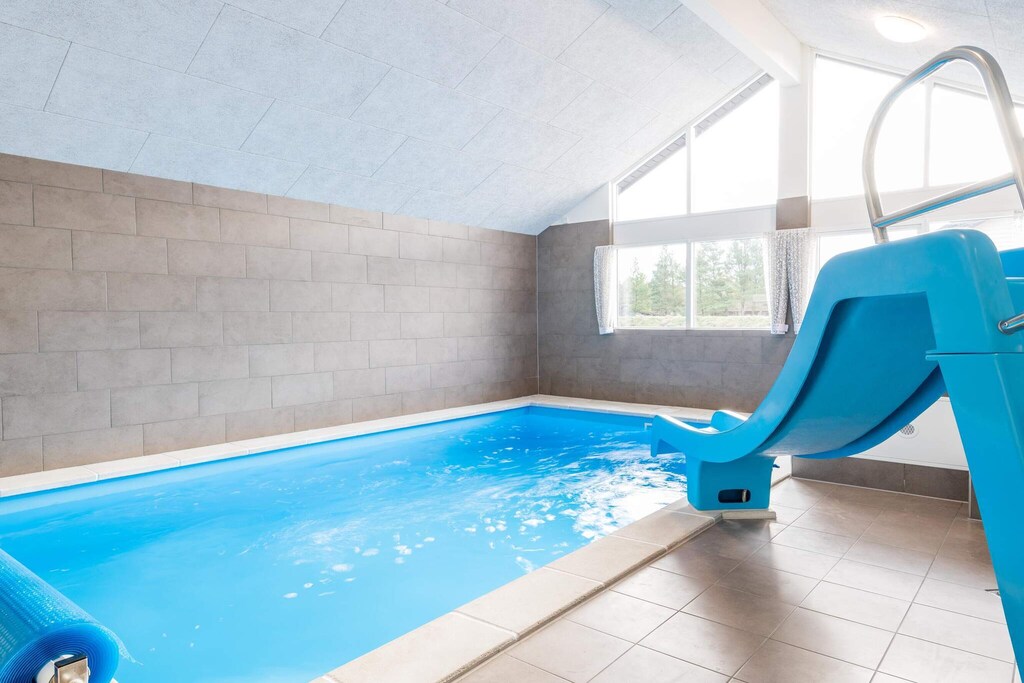Maximum 2 dogs. Well-appointed holiday home at Houstrup Strand with large pool area featuring a large swimming pool with water slide and swim trainer, sauna, shower, and hot tub with room for 4-6 people. After an enjoyable and eventful day, it is wonderful to relax in the house's large hot tub or warm up in the sauna. On the other side of the centrally located dining/living room, you enter the activity room, where you can play darts or billiards at the pool table. Here you can also challenge each other to a game of table tennis or soccer. Even a stereo system, PlayStation 4, and flat-screen TV are installed in the activity room. The house is extremely spacious and well-proportioned, with two separate sleeping areas. Each area has a bathroom, and there is an additional bathroom connected to the pool area. There are three bathrooms in total, all with showers and underfloor heating. One of the bathrooms is also extra child-friendly with a children's toilet. All six bedrooms and the loft have box mattresses. There is underfloor heating throughout the house. The dining/living room is tastefully decorated with a TV with Viasat satellite and over 100 channels, a stereo system with CD player, Blu-ray player, high chair for the little ones, sofa area, and wood-burning stove. Outdoors, there is an open sun terrace and a covered terrace - perfect for a cozy barbecue evening with family and friends. There is also a trampoline (use of which is at your own risk/insurance).