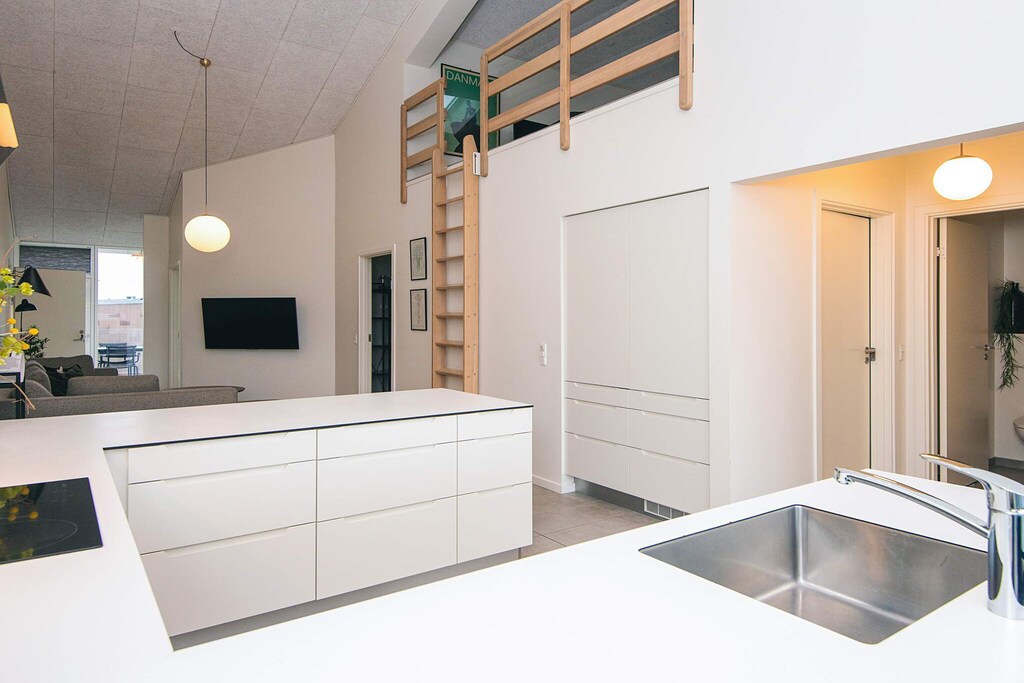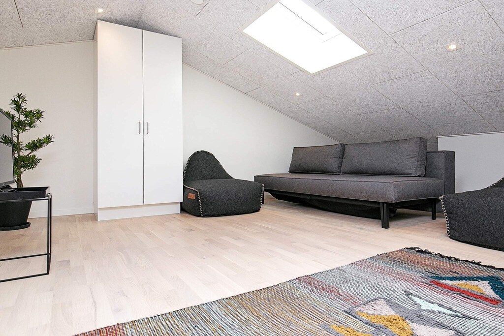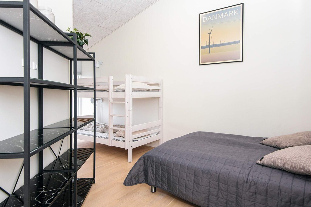 This attractive luxury apartment with whirlpool and sauna and plenty of space for eight people is from 2019 and located in the middle of Søndervig. The apartment is located on one of the west coast's best grounds, in the first floor, just approx. 100 m from the beach. The decor is tasteful, exclusive and modern with all the comfort you could wish for. The apartment is located on the 1st floor and has a nice view of the dune landscape from the terrace. There are three bedrooms, two of which have a double bed and the last one also has a bunk bed. In addition, loft with two beds. There is a hot tub and sauna in the large bathroom. Two large terraces towards resp. east and west so you can enjoy both sunrises and sunsets. The apartment is within walking distance of restaurants and shopping in Søndervig and only approx. 100 m from the beach, the North Sea, fitness and bowling center m.m. Free access to Søndervig's subtropical water park and activity cellar with i.a. billiards and table tennis. Not for rent to youth groups.
