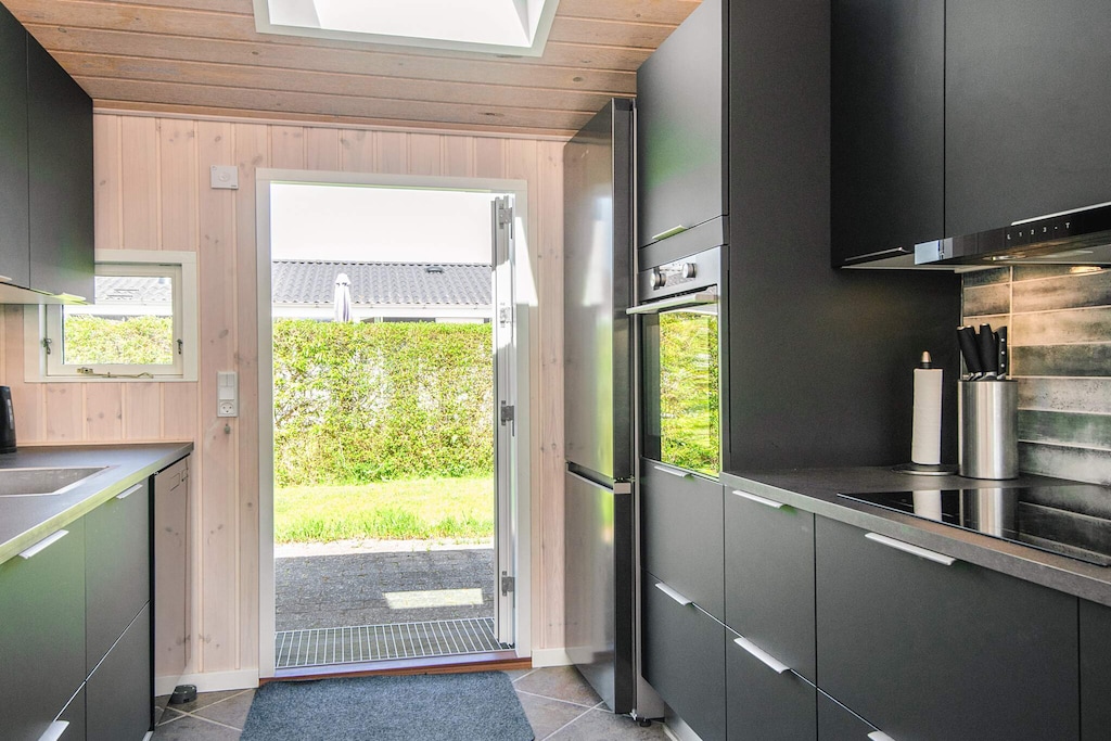 This holiday home with whirlpool and sauna is located by Grønninghoved Strand. The heart of the house is the kitchen-dining room, which the three bedrooms are adjacent to. The cottage is furnished with new furniture etc. in light and Nordic style for the summer season 2019. The cottage has all kinds of technical aids such as. washer, dryer, heat pump and dishwasher. The outdoor life is also something very special here, as you will be able to stay on terraces facing all corners of the world. In addition, there are deck chairs in different designs. The red steaks can be made on the garden grill. The cottage's garden is almost closed and thus child - friendly. Inside there is a high chair and cot for the little ones. There is a robotic lawnmower by the cottage. There are charging sockets for electric car. Not for rent to youth groups.