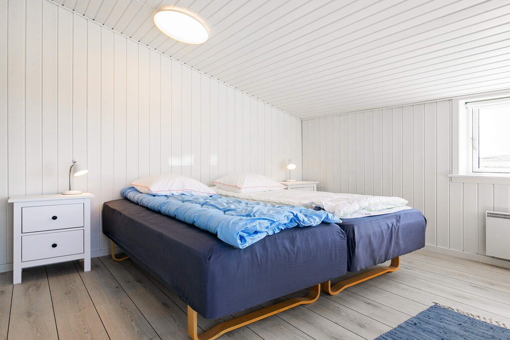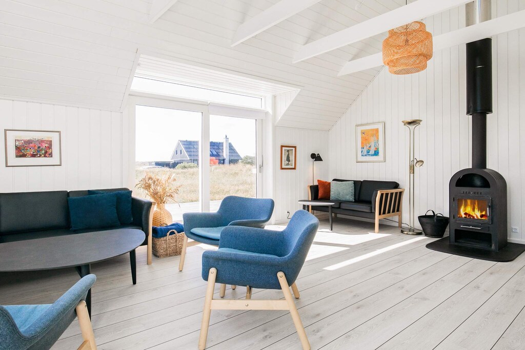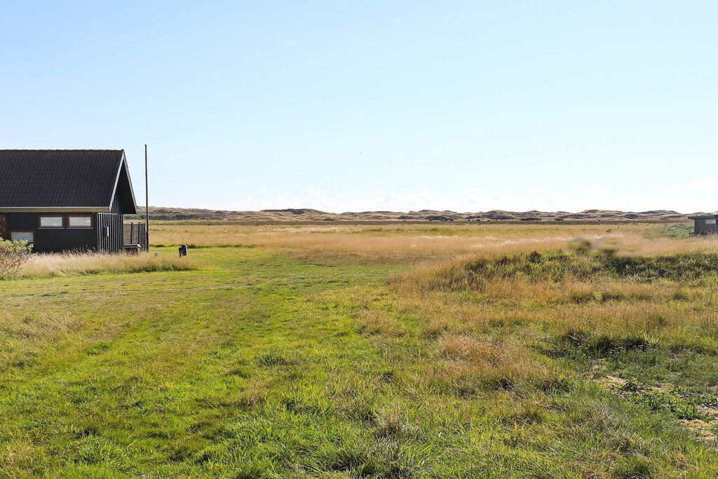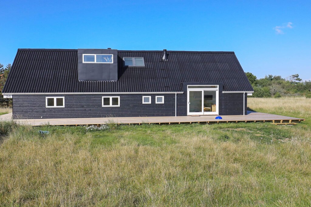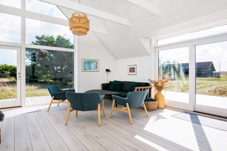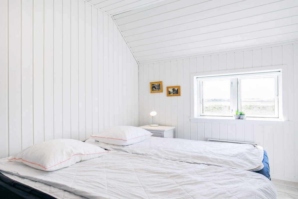 Bright, renovated cottage in Kandestederne with a good setting to gather the large family or 2 families in lovely and quiet surroundings, not far from the West Coast and the most beautiful natural surroundings. The cottage, which is on 2 levels, is furnished with ground floor with nice kitchen with dining area, bathroom and living room with a fantastic light from i.a. the large window section in the gable to the east, where the morning sun enters. The living room is almost extended with the exit to the large south-facing terrace, where there is sun all day. There are three rooms with single beds (can be combined into a double bed). From the kitchen there are stairs to the first floor landing with distribution to another bathroom with a view of the dunes and a view of the Råbjerg mile. On the first floor there are also two rooms with single beds (can also be combined into double beds). From the cottage it is only 200 m to the famous Hjorts Hotel with restaurant and approx. 800 m to the good, wide beach by the North Sea. Not for rent to youth groups.