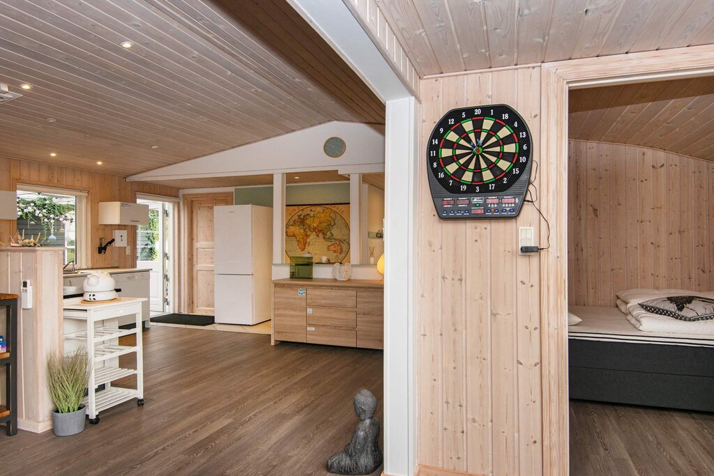 Well-located vacation home with water views both outside and inside, situated on a 1278 m² natural plot with trees, only approx. 450 meters from the Limfjord and the child-friendly beach in Toftum Bjerge. PLEASE NOTE: The house is rented for a maximum of 14 days at a time per stay. The summer house is bright and inviting and is practically furnished with a living room/kitchen. The living room offers free internet, comfortable furniture, and a flat-screen TV with Chromecast, allowing you to stream your own TV services. There is also a wood-burning stove (pellets) to spread cosiness and warmth on a cool summer evening or a rainy and windy autumn evening. From the living room, there is also a view of the fjord. The kitchen has a ceramic stove, microwave, refrigerator/freezer, and dishwasher. The house is also energy efficient with a heat pump, allowing for lower consumption. There is also a washing machine. Bright bathroom with shower and underfloor heating. There are three bedrooms, two with double beds and one with a single bed. There is also an extra portable bed. The house is also an activity center with plenty of entertainment for the whole family, including table tennis, electronic darts, and PlayStation 3 with games. The garden also offers fun and cozy moments for the whole family with a trampoline (use at your own risk) and a fire pit where the whole family can enjoy making s'mores and marshmallows. The garden is fenced in, providing both privacy and a safe environment for small children and animals. There is both a covered terrace and an open terrace. The open terrace has comfortable garden furniture and two sun loungers. There is also a gas grill where you can enjoy dinner while watching the sun set over the fjord. The nearby campsite has shopping facilities, a cafeteria, and free access to the campsite's playground and bouncy castle, as well as the opportunity to enjoy the animals. Not available for rental to youth groups.A refundable deposit might be charged closer to your check-in date. The security deposit ensures a smooth stay and covers any additional services or consumption charges.This deposit covers utilities consumed during your stay and any additional services that may be taken.The final amount will be adjusted based on actual meter readings, actual usage of extra services, and any remaining balance will be refunded within 21 days after checkout.This deposit simply acts as a prepayment for charges that you would anyways pay for, ensuring a seamless stay and check-out experience.