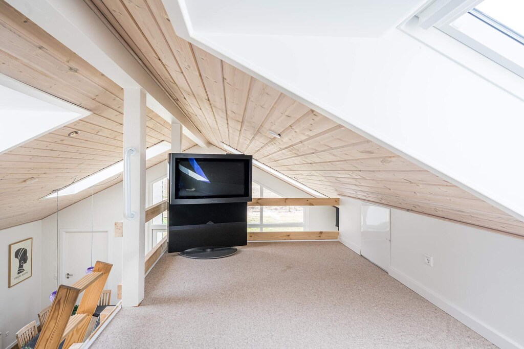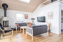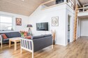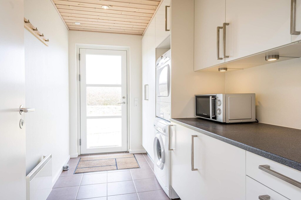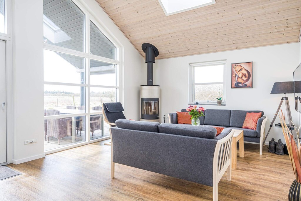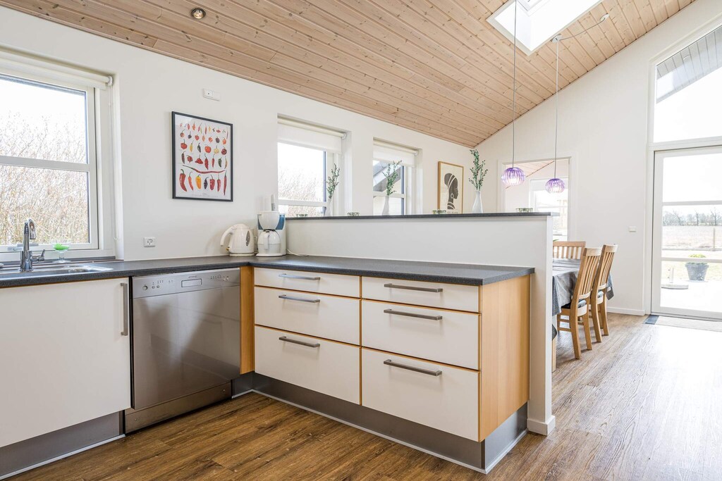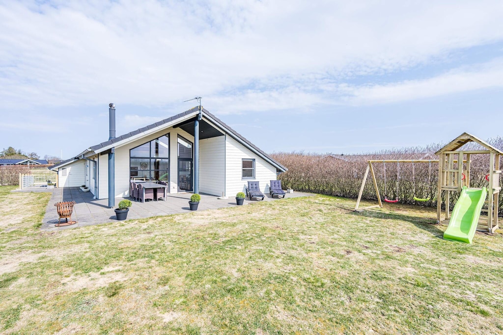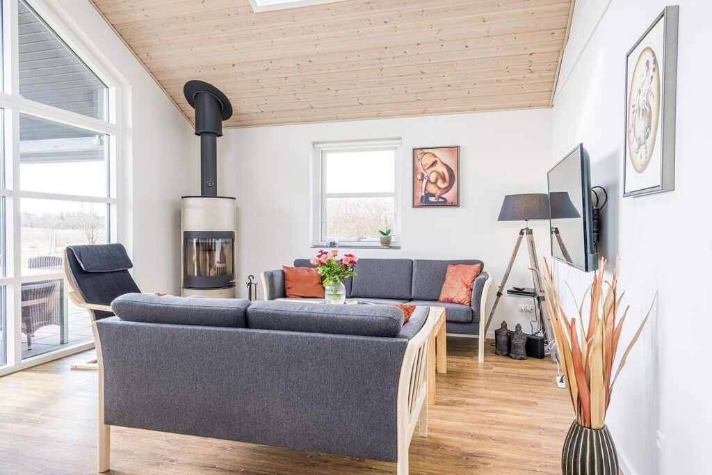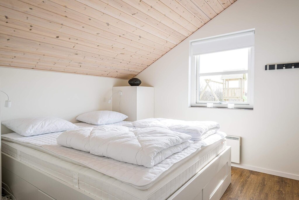 MAX 2 DOGS - Superb cottage for 6 people in Skaven Strand. The cozy living room with wood-burning stove is open to the kitchen, and everything is bright and attractive. From here, there is access to a lovely covered terrace with a view of the fields. The cottage has 3 bedrooms, one with a double bed and the other two with 2 single beds. There is also a large bathroom with spa and sauna and a smaller toilet. The grounds are lovely, with plenty of space for playing and relaxing in the garden. You will find, among other things, a play tower with a slide and swings and a small campfire site. The grounds are fenced in, making it perfect for children or dogs to run around freely in the garden. If you have a Netflix account, you can watch it on the TV. There are also 2 high chairs and 2 cribs in the cottage. A super nice cottage with spa and sauna in Skaven Strand. The house has a bathing agreement (swim and play) with access to 6 swimming pools, as well as various sports options including mini golf in Ringkøbing and bowling in Varde.