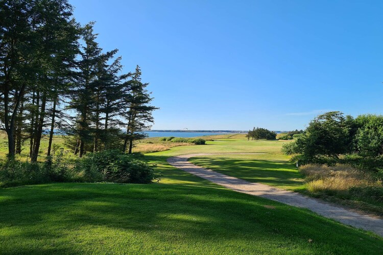 Ein Holzhaus mit großer Terrasse und Wiese. Nahegelegen zum Wasser.
