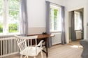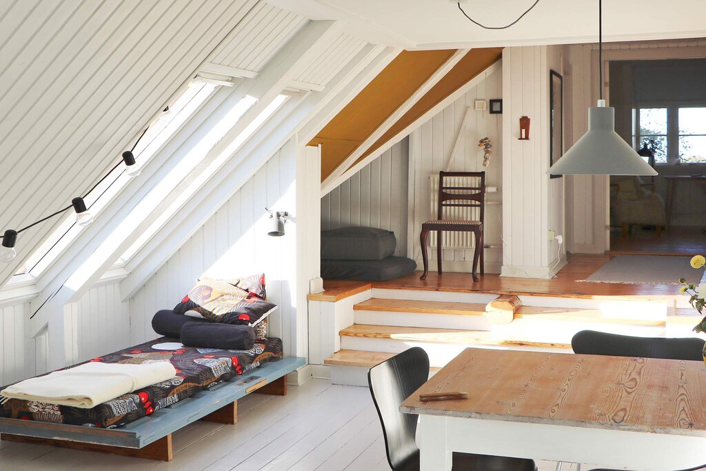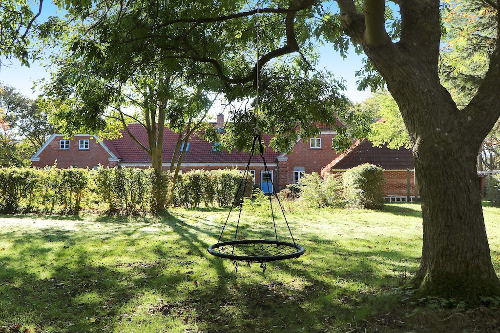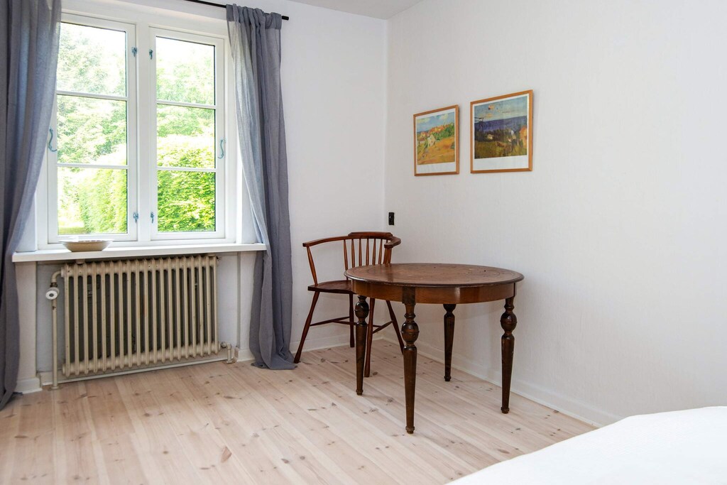 This large and well-appointed cottage is the former village school in Staby. The holiday home, which is designed for 20 people, is located calmly and peacefully with a view of fields to one side - and to the other offers a courtyard and a large natural plot, surrounded by beech hedges. Life is enjoyed in a closed and flourishing oasis. The organization of the house provides an opportunity for community, but also for people to retire. The building is certified worthy of preservation and a true gem for a multi-generational holiday, a writing stay or a good change from a busy everyday life. The 250 m2 ground floor is divided into a contiguous eastern and western section. Seven of the rooms are over 20 m2. The heart of the house is the large fireplace room, which is also furnished with the house's common dining room and a well-equipped kitchen with two ovens m.m. In the adjoining TV room there is also a well-tuned Hornung and Møller grand piano. In addition, & # 8217; East & # 8217; of three bright rooms & # 8211; all equipped with double beds. In addition, there are two smaller bathrooms with underfloor heating. & # 8217; Vest & # 8217; is a separate apartment with three bedrooms with double beds and two living rooms - equipped with large work table, wood stove and panoramic window to the west with a wonderful afternoon and evening light. In this department there are two large bathrooms. From both east and west there is access to the house's large southern lawn surrounded by powerful beech trees. On the first floor to the south / west, another independent apartment offers itself with a bright and cosily furnished living room with day-bed and dining table. There is open access to a smaller kitchen, and in connection with the living room there is the possibility of two extra beds in alcove-like interiors. In addition, there are three large rooms - with new double beds and desks. There is also access to the bathroom incl. shower on the first floor. The tranquility spreads accompanied by the view and the many incidents of light. Utility room with washer and dryer. The cottage is i.a. also equipped with free, wireless