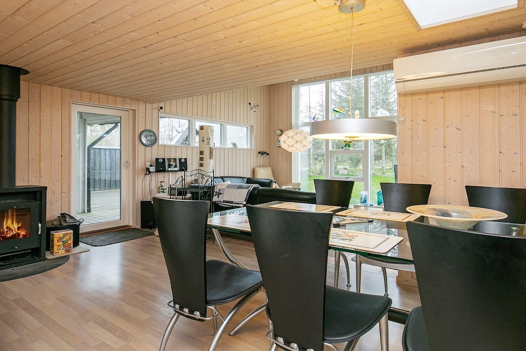 At Nørhede by Nissum Fjord you will find this well-kept and brightly decorated cottage at the end of a closed road. The cottage is furnished with a well-equipped kitchen in open connection with the combined living and dining room. From the living room you can enjoy the surrounding nature through the large windows, while you snuggle by the wood stove on a cool summer evening. The living room is equipped with i.a. energy-friendly heat pump, TV with satellite dish and DVD player and there is access to the partially covered terrace, which also connects the house with the annex. The annex is equipped with radio, electric heating and two single beds. In addition to the bathroom with underfloor heating and the large entrance hall with a combined washer and dryer, the cottage is also furnished with two bedrooms which are both equipped with good double beds. The cottage is decorated in a cozy and atmospheric style, which provides a good atmosphere for a real family holiday or for a couple holiday. Not for rent to youth groups.