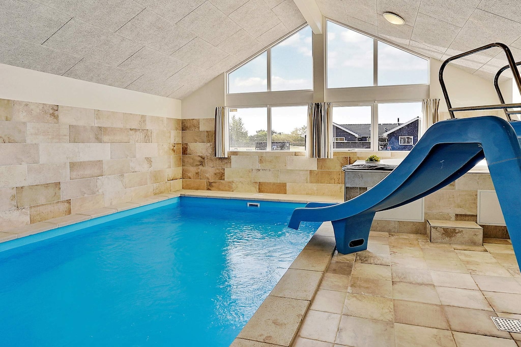 Holiday cottage in Vejby with everything needed for an active holiday. The pool room has both 18 m² swimming pool, slide, counter-current system, large built-in whirlpool and a sauna seating 4-6 people. In the activity room you can play billiards, darts and table tennis. There are TVs in several sections of the house and also PlayStation4 and Nintendo Wii. The house is very spacious and well-dimensioned and built around 2 separate sleeping areas. Each area has a bathroom and there is an extra bathroom adjacent to the pool area. All bathrooms naturally have underfloor heating through geothermal heating. There are 7 bedrooms. In the garden you will find a lowered trampoline (usage at own risk/insurance). Payment for consumption, and deposit must be paid in cash to the concierge at the house. No letting to youth groups.