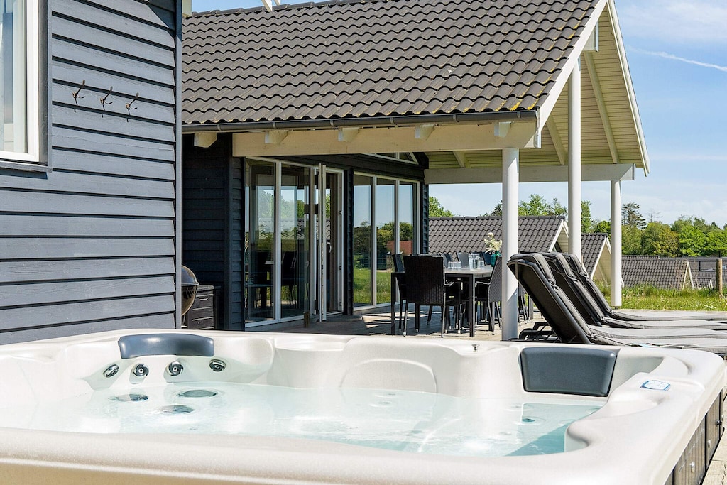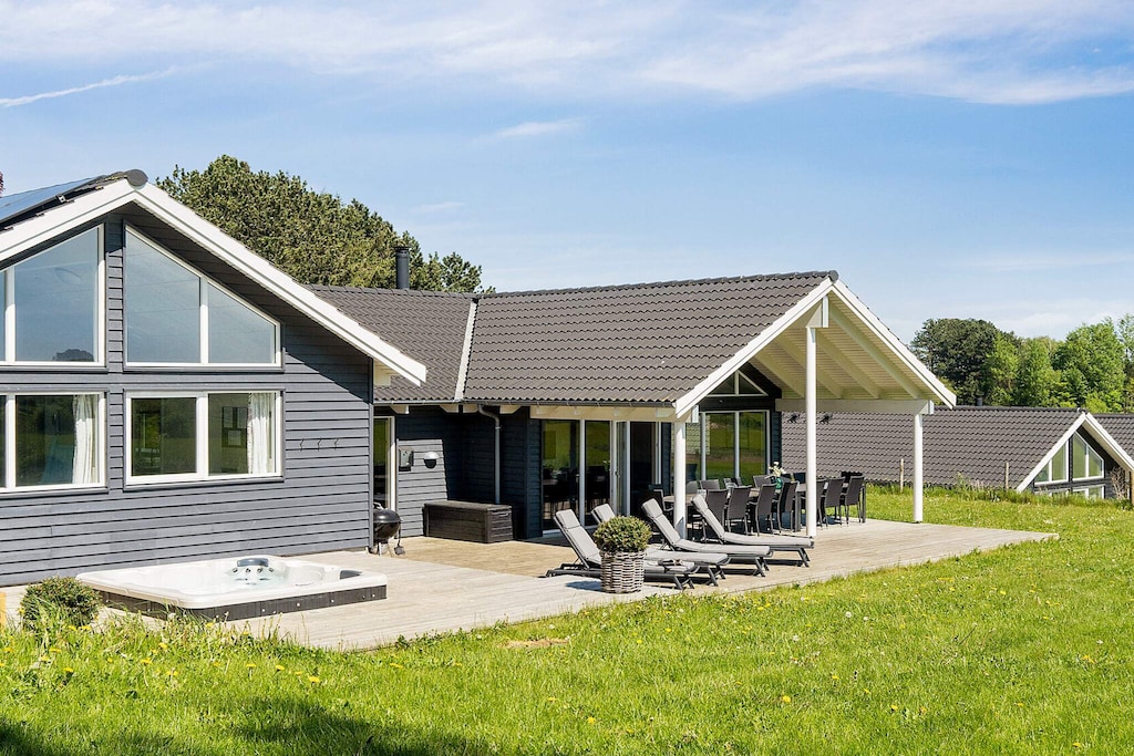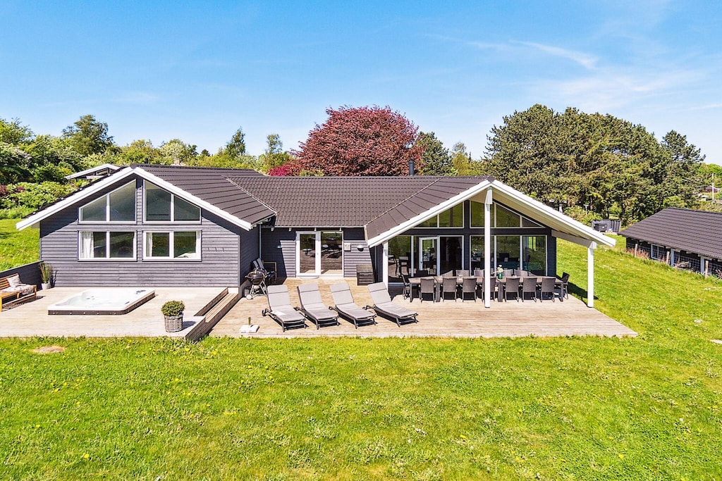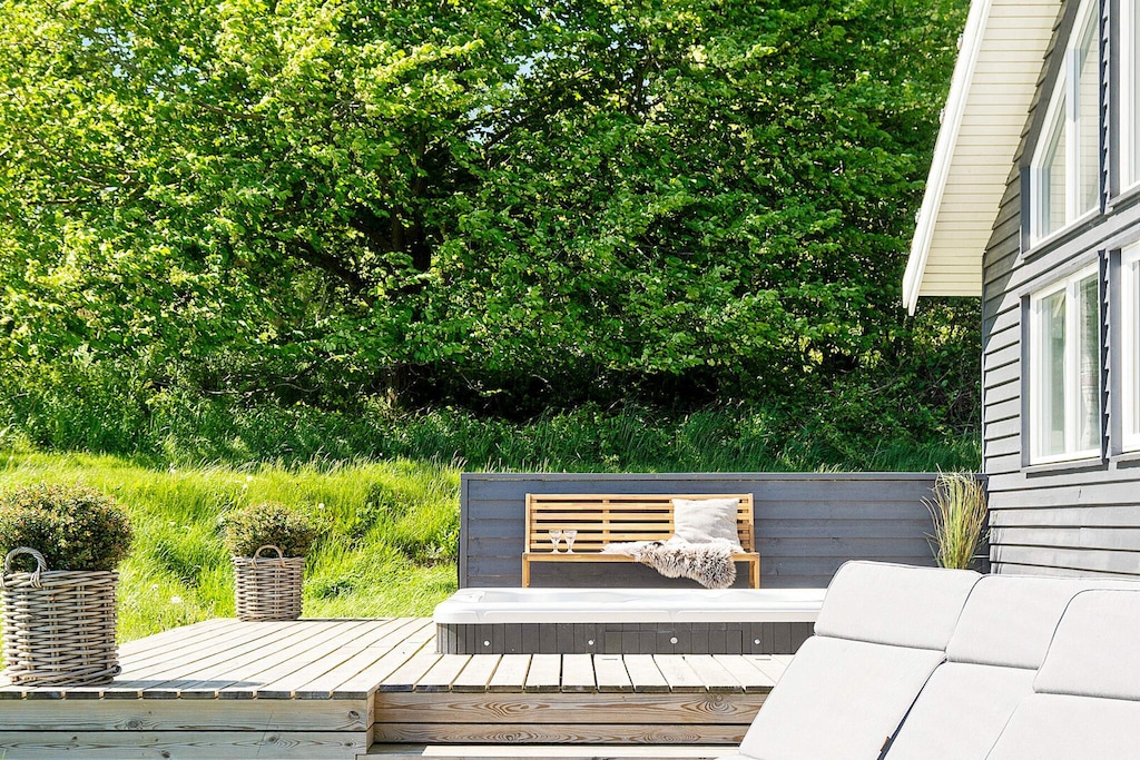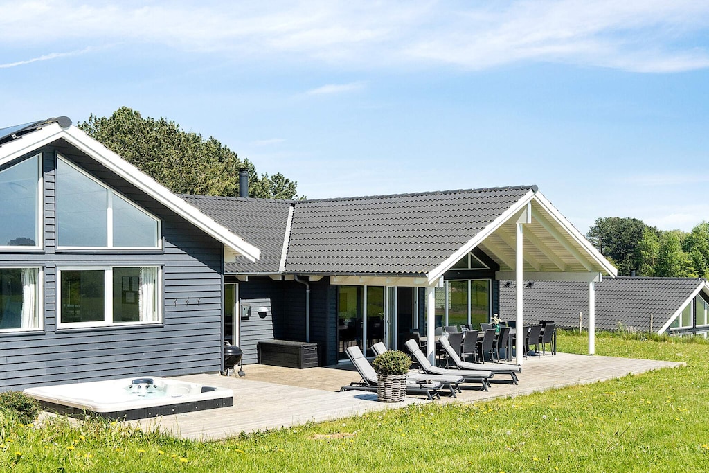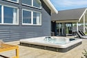 Well-furnished holiday cottage with swimming pool and activities with every amenity needed for an active holiday. The impressive pool room has an 18 m² large swimming pool with slide, counter-current system and a 4-6 people whirlpool as well as a large sauna. There is also an outdoor hot tub. The house is very spacious and built around 2 separate sleeping areas with bathrooms. There is also a large mezzanine which will undoubtedly be a hit with the children. The natural gathering point in the house is the large and architectural interesting room with combined kitchen and living room. The well-appointed kitchen has plenty of room for the various cooks. The tastefully furnished living room has comfortable furniture and a wood-burning stove as well as a large flatscreen-TV. On the other side of the centrally located living/dining room you will find the large activity room where you can play darts or pool or just relax in the sofa in front of the flatscreen-TV. There is a large, partially covered terrace where you can enjoy the Danish summer. On the large plot surrounding the house you will find swings and a sandpit for the children. No letting to youth groups. Please note: photos are taken from a similar house.